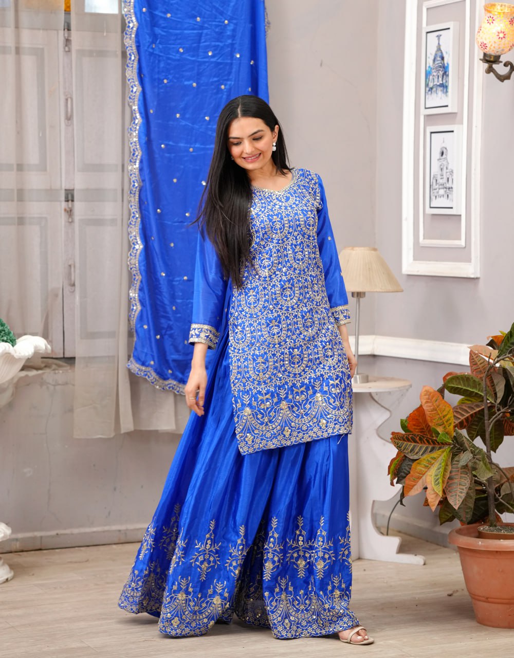 Top, Fabric : Chinon, Inner : Micro, Work : Sequence Embroidery Work, Top length : 36 inch, Stich : S(36), M(38), L(40), XL(42), XXL(44), sharara, Fabric: Chinon With Embroidery Work, Inner : Micro, Stich :- Full Stich With Elastic, Bottom Length: 40 inch, Dupata, Fabric : Chinon With Heavy Embroidery Work, Work. : Sequence Embroidery Work, Length : 2.2 meter.