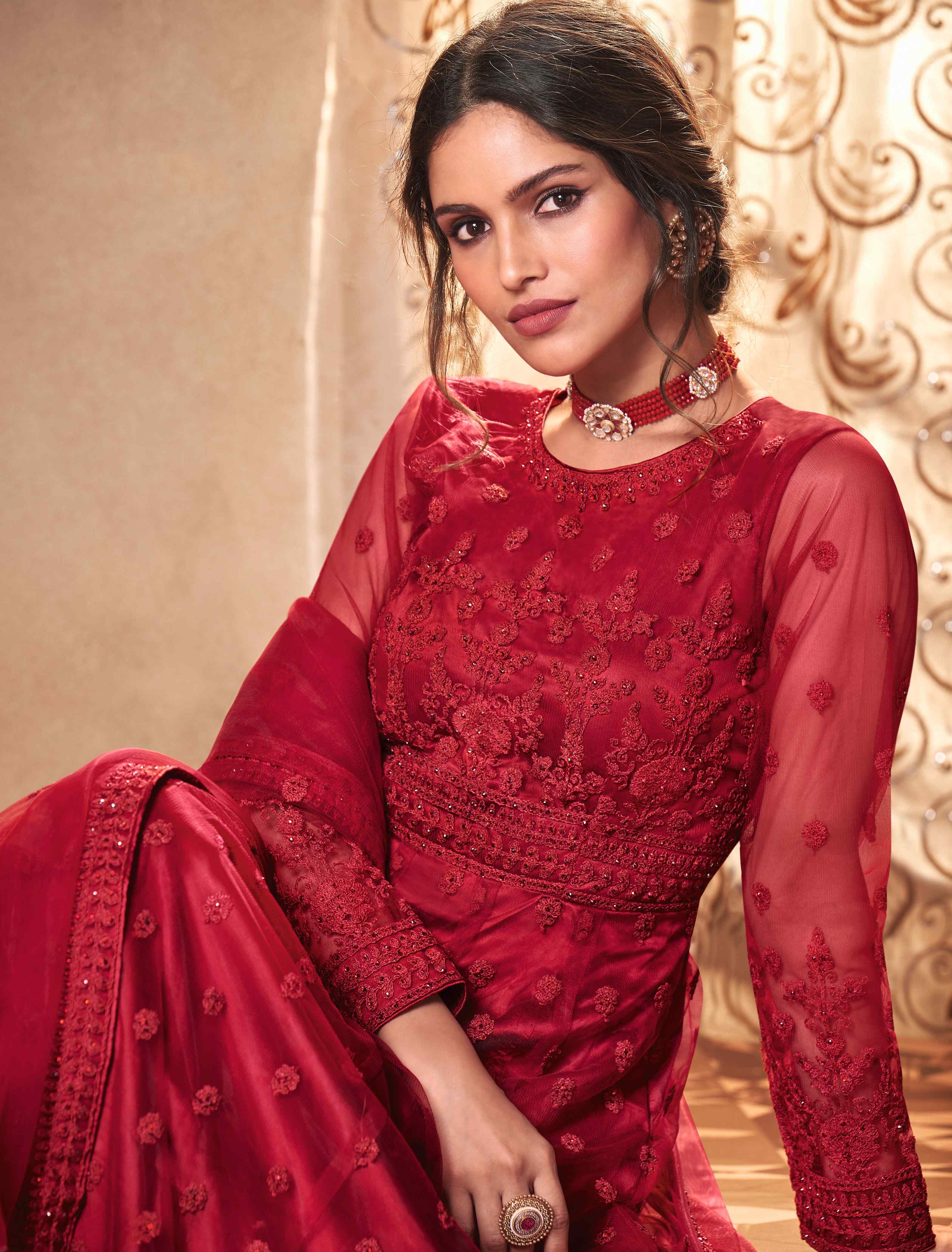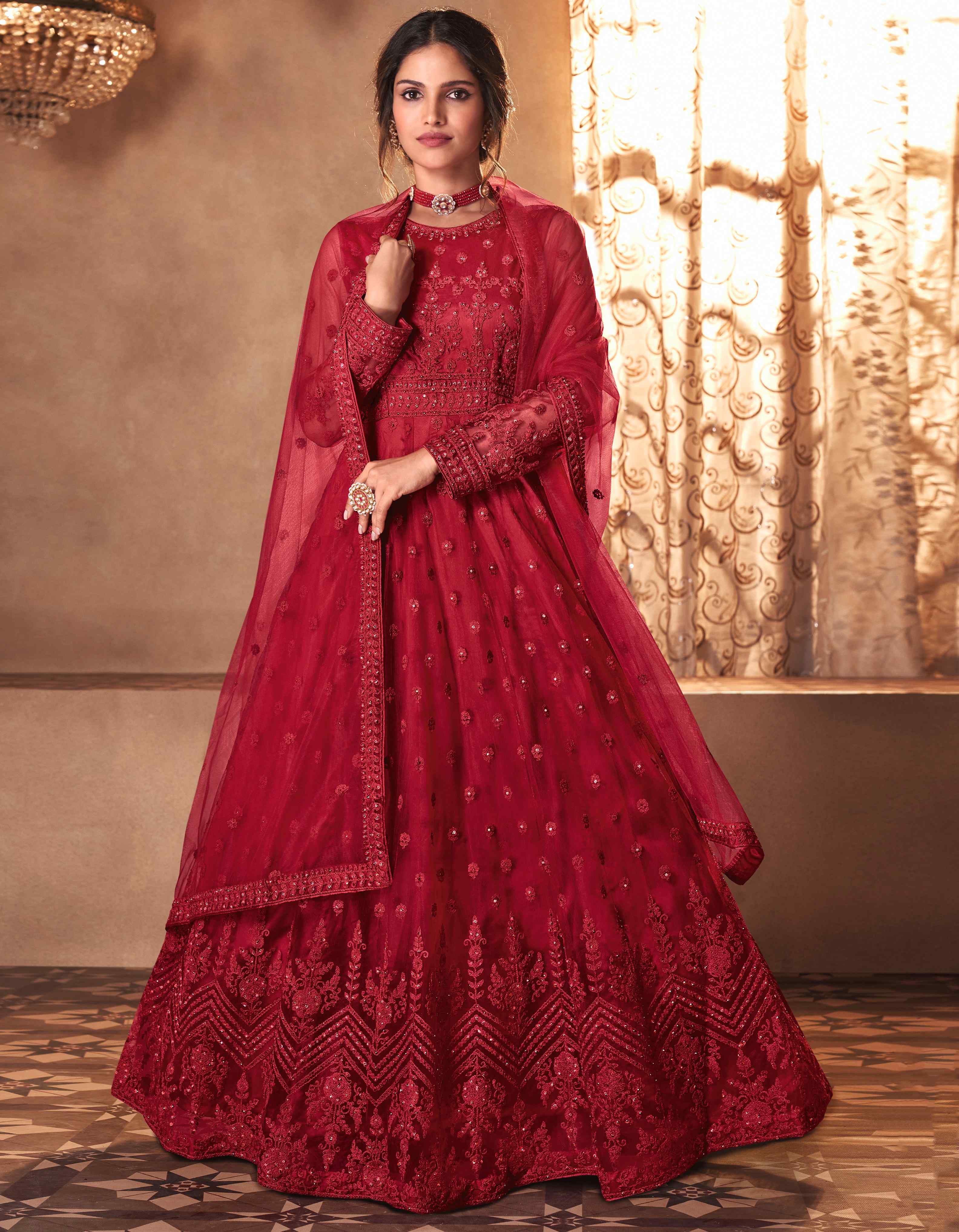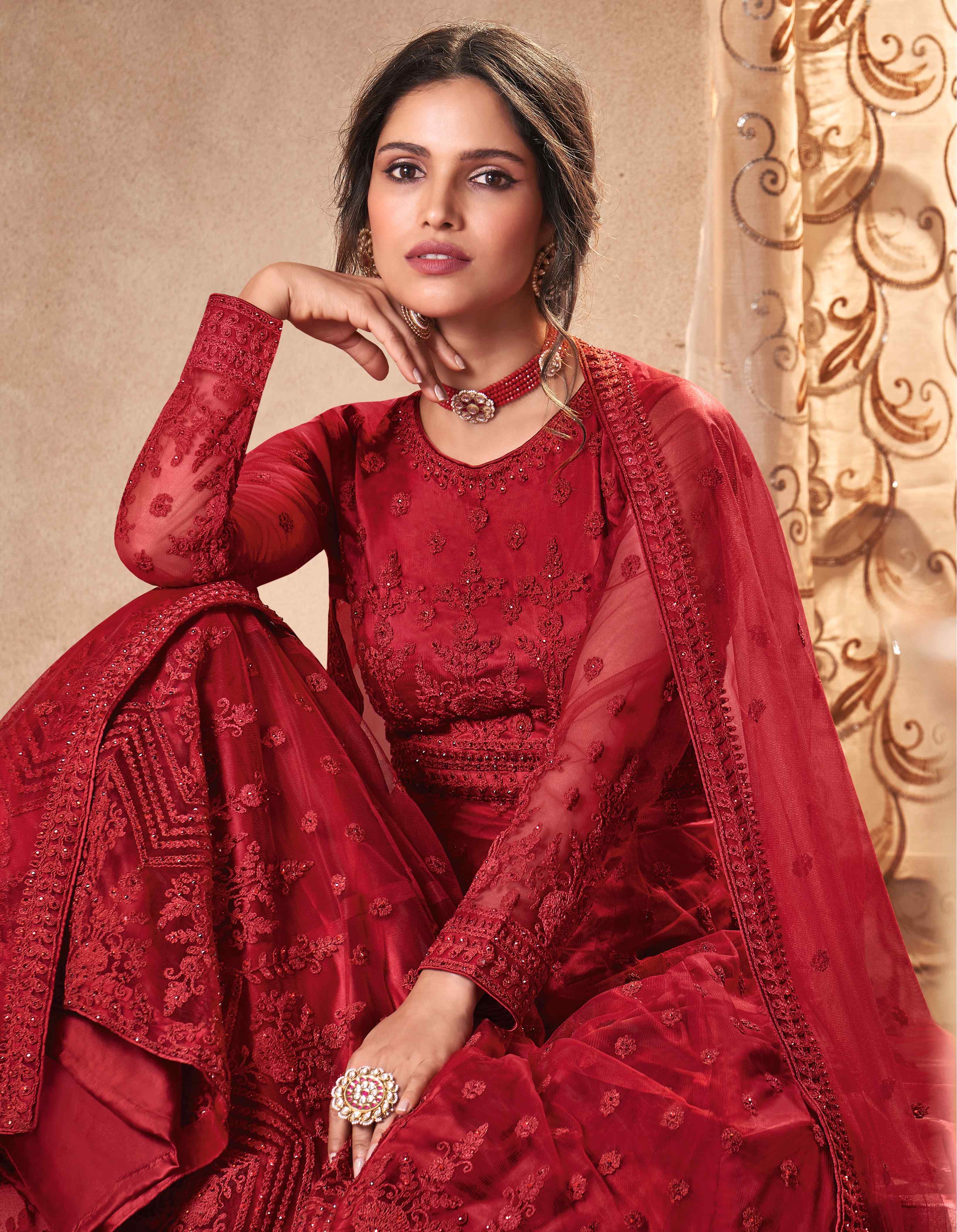 Designer Ethnic Suit Set with Dupatta Net Fabric Dori Embroidered With Diamond Work for Women – Red Color