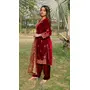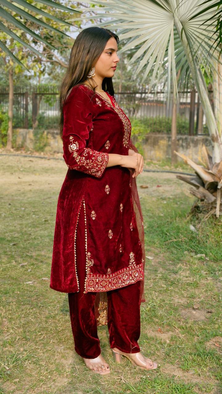 Maroon velvet elegance with rich golden embroidery a perfect blend of grace, tradition & luxury.