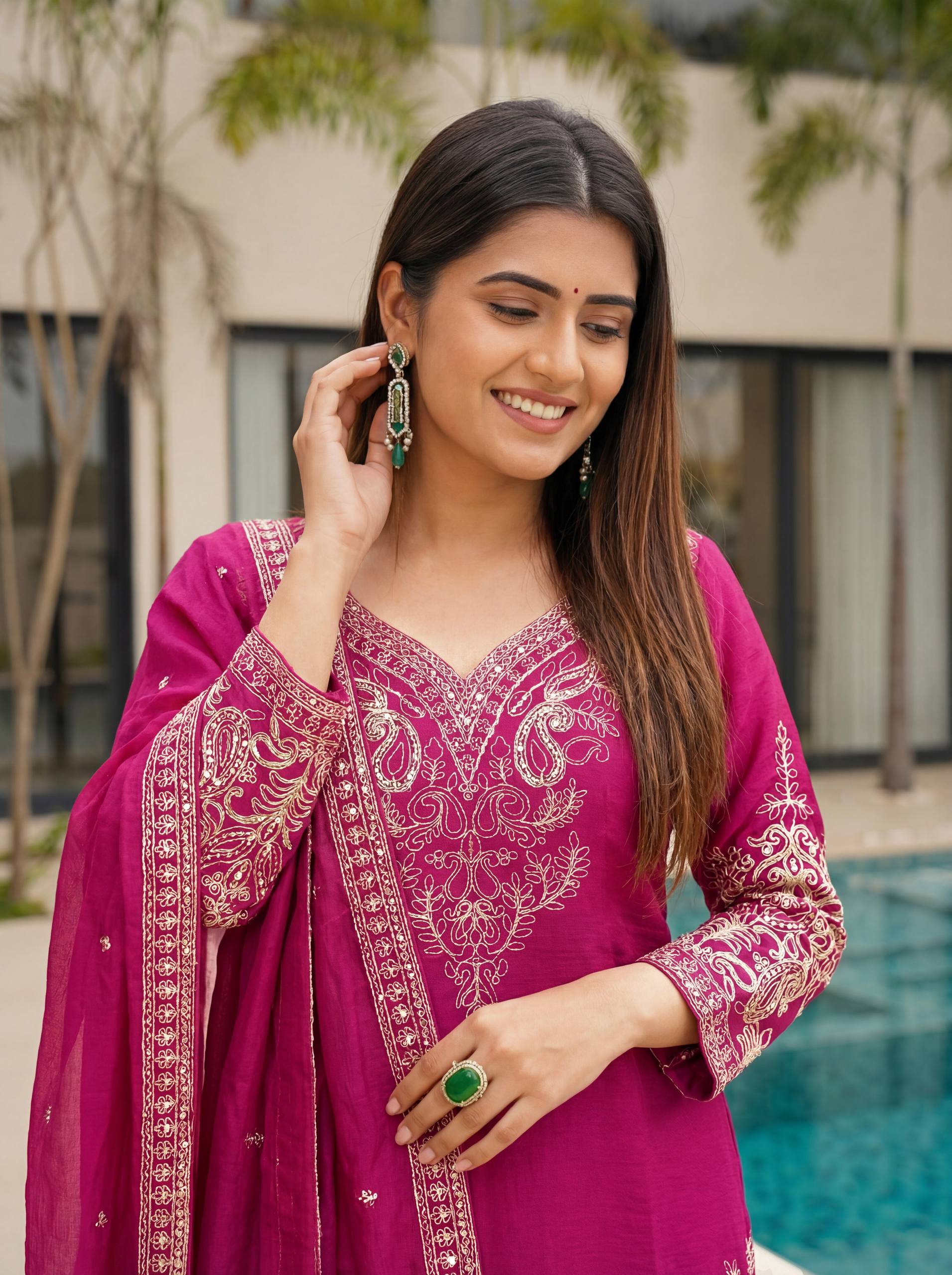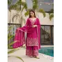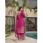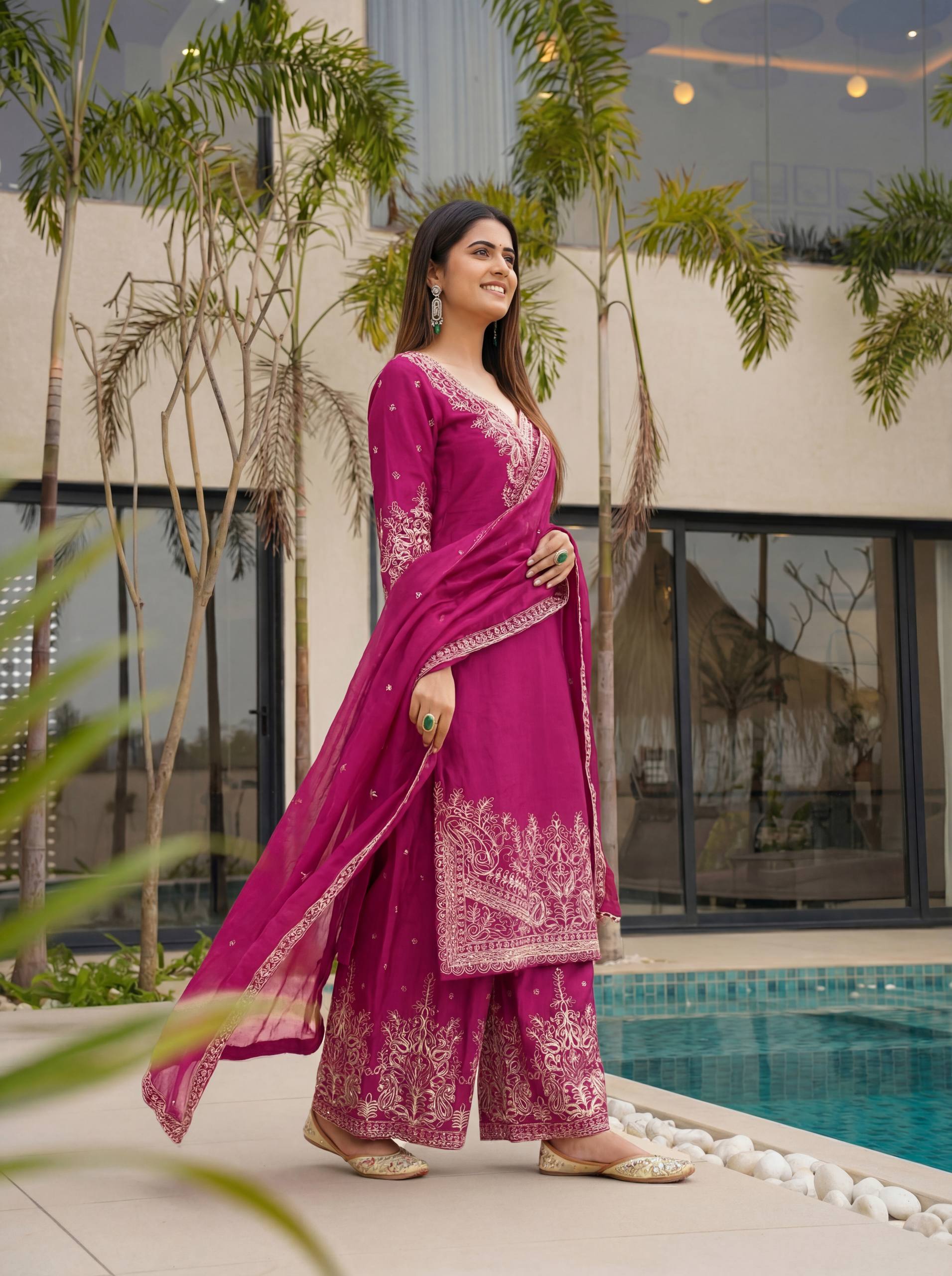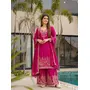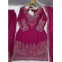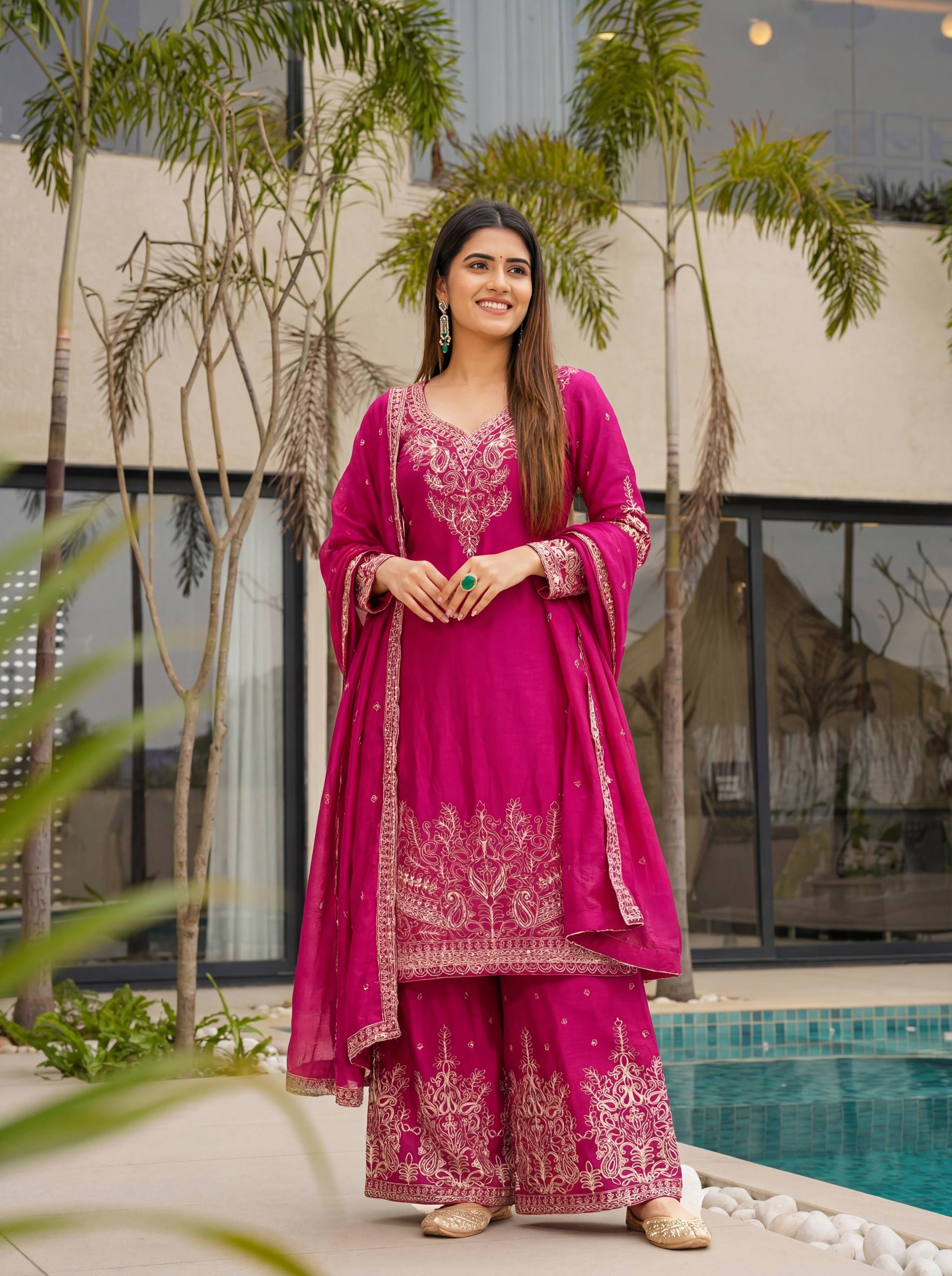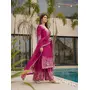 Elevate your festive style with these stunning embroidered sharara suits a perfect blend of grace, tradition, and modern charm. Whether its a wedding, festive gathering, or celebration, these rich hues of black, rani and purple are designed to make you shine.