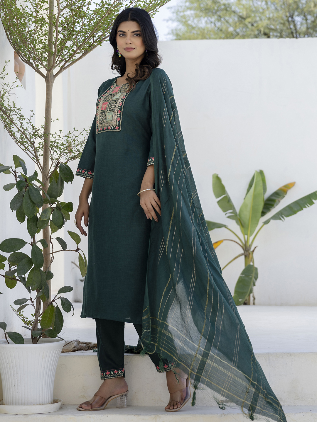 Attractive These Beautiful Readymade Suits With Dupatta.These Suit is Fabricated On Top Are Cotton Blend And Bottom Are Cotton Blend And Chanderi Dupatta .Its Beautified With Designer Embroidery Work.