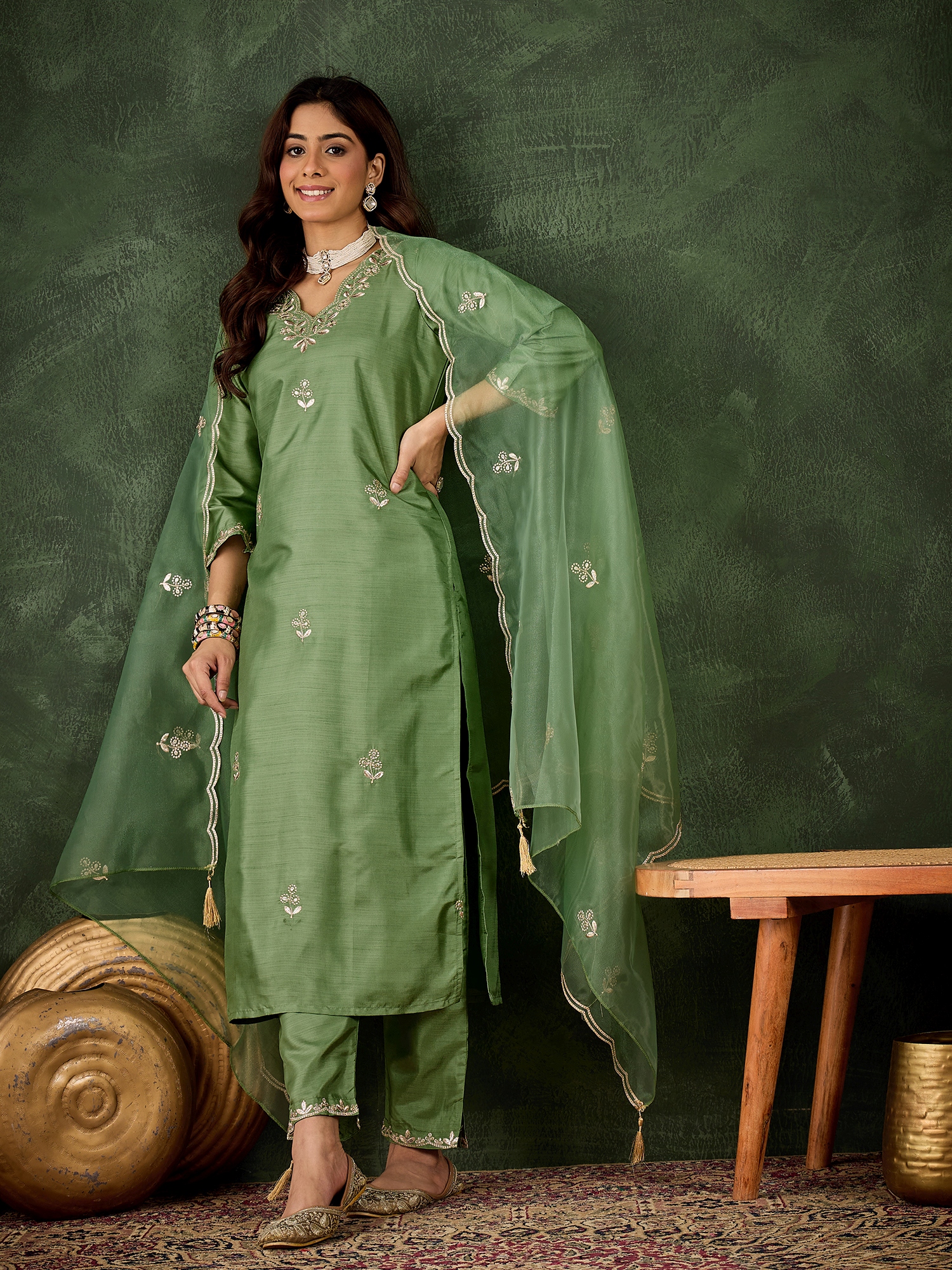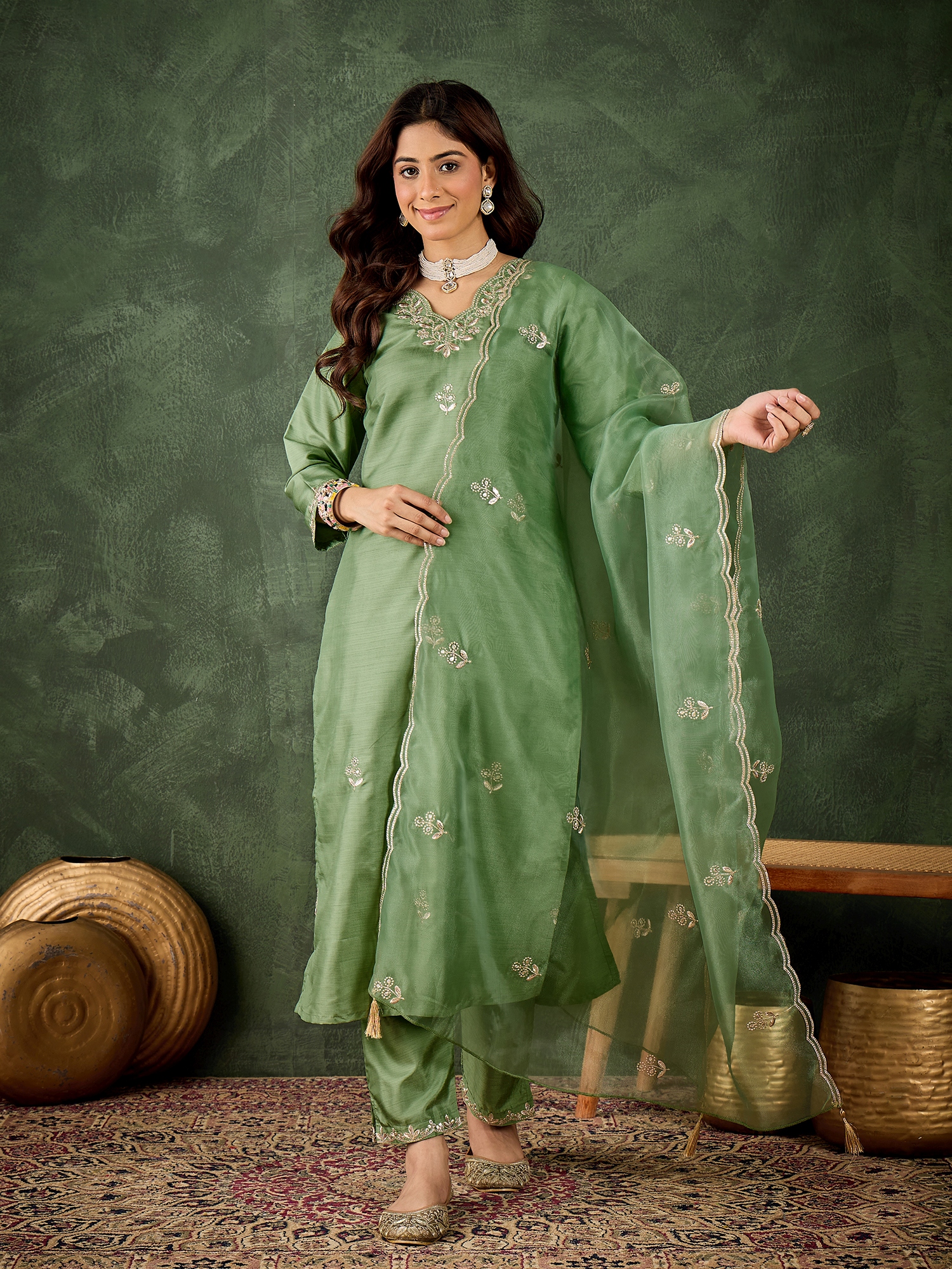 Green Color Smart Silk Blend Fabric Designer Embroidery Work Ceremonial Kurta Set