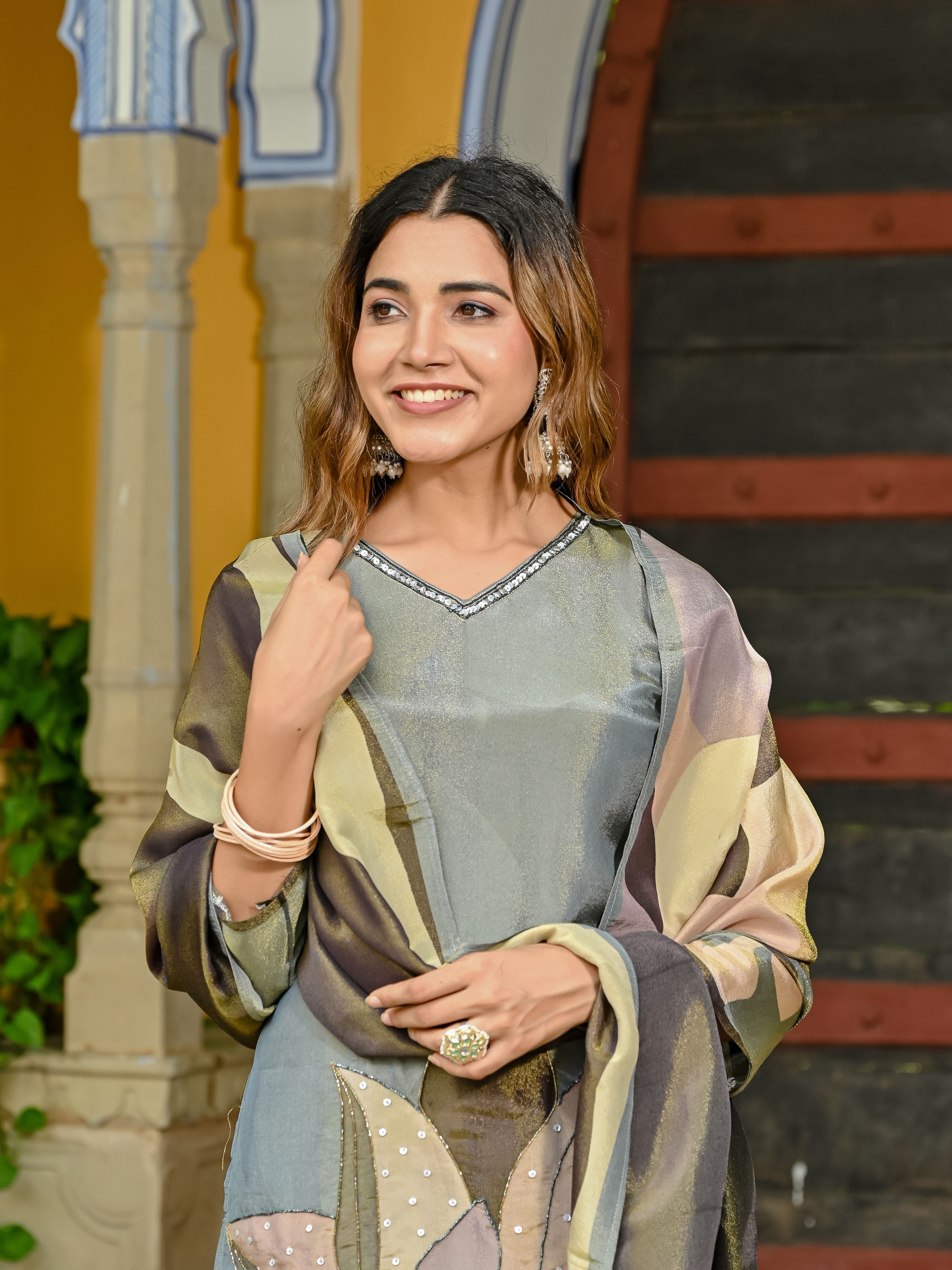 Grey Color Beautiful Jari Tissue Fabric Readymade Stylish Ethnic Suits For Girls