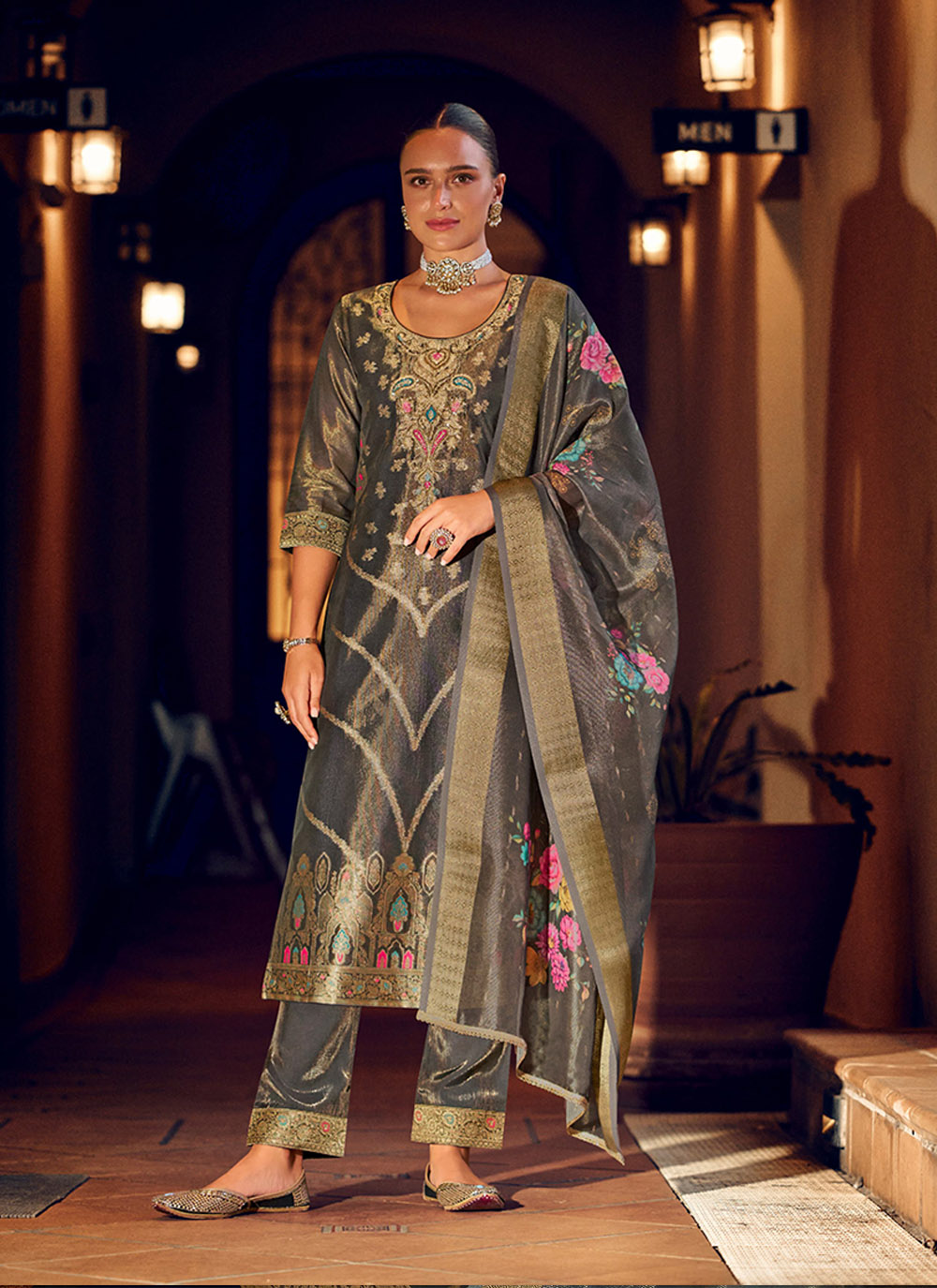 Grey Color Shimmer Silk Fabric Woven Designer Readymade Salwar Kameez