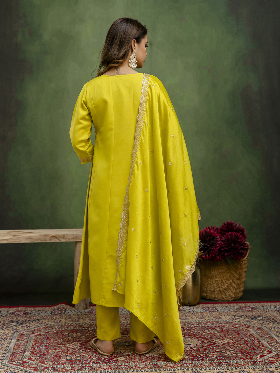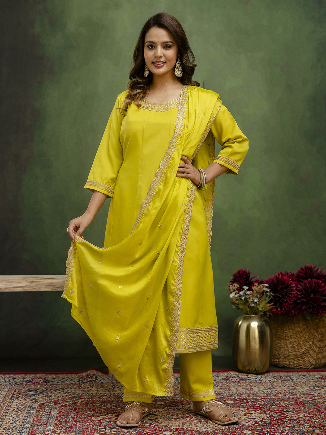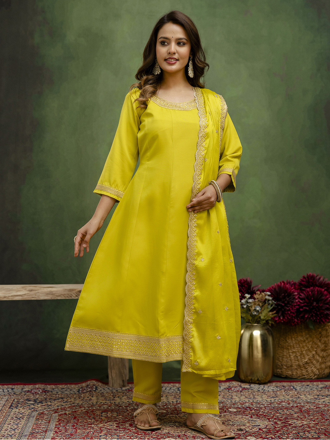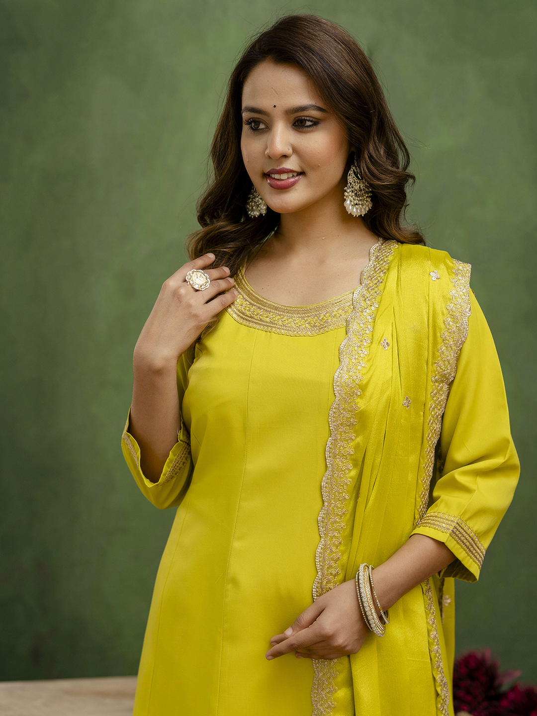 Lemon Color Viscose Rayon Fabric Designer Embroidery Work Formally Ethnic Readymade Kurta Set
