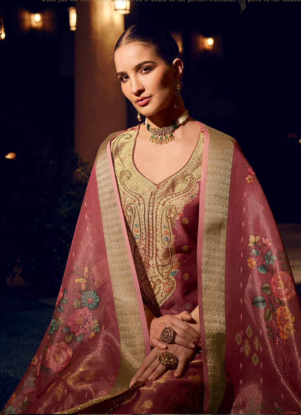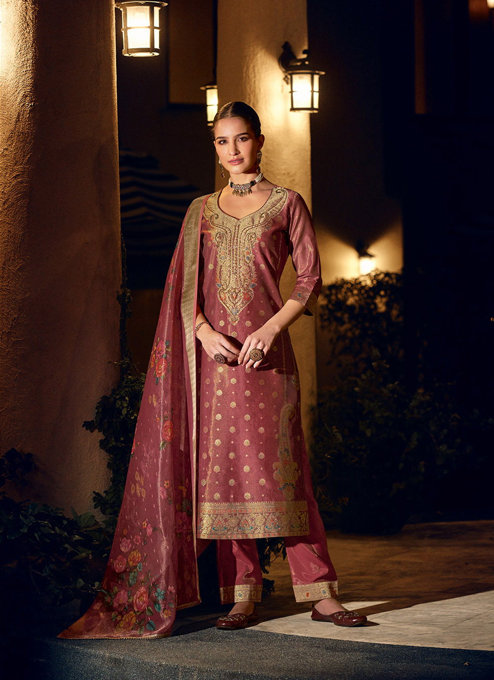Attractive These Beautiful Looking Readymade Suits.These Top Are Shimmer Silk And Bottom Are Shimmer Silk And Dupatta Are Shimmer Silk Fabricated.Its Beautified With Wevon Jacquard Jari Designer,Hand Work With Digital Printed Dupatta.