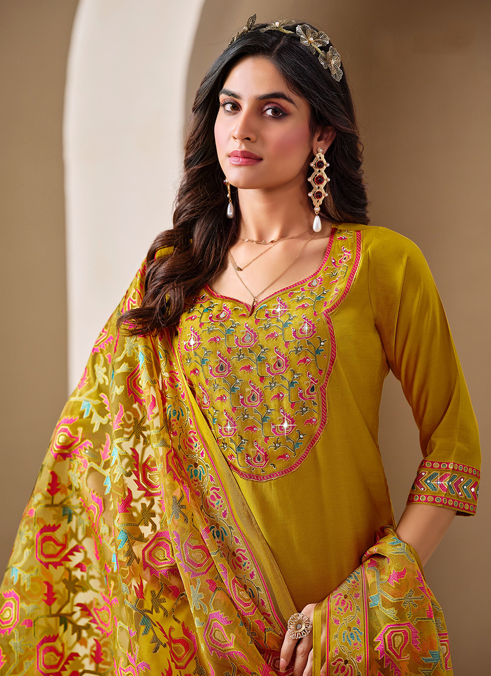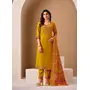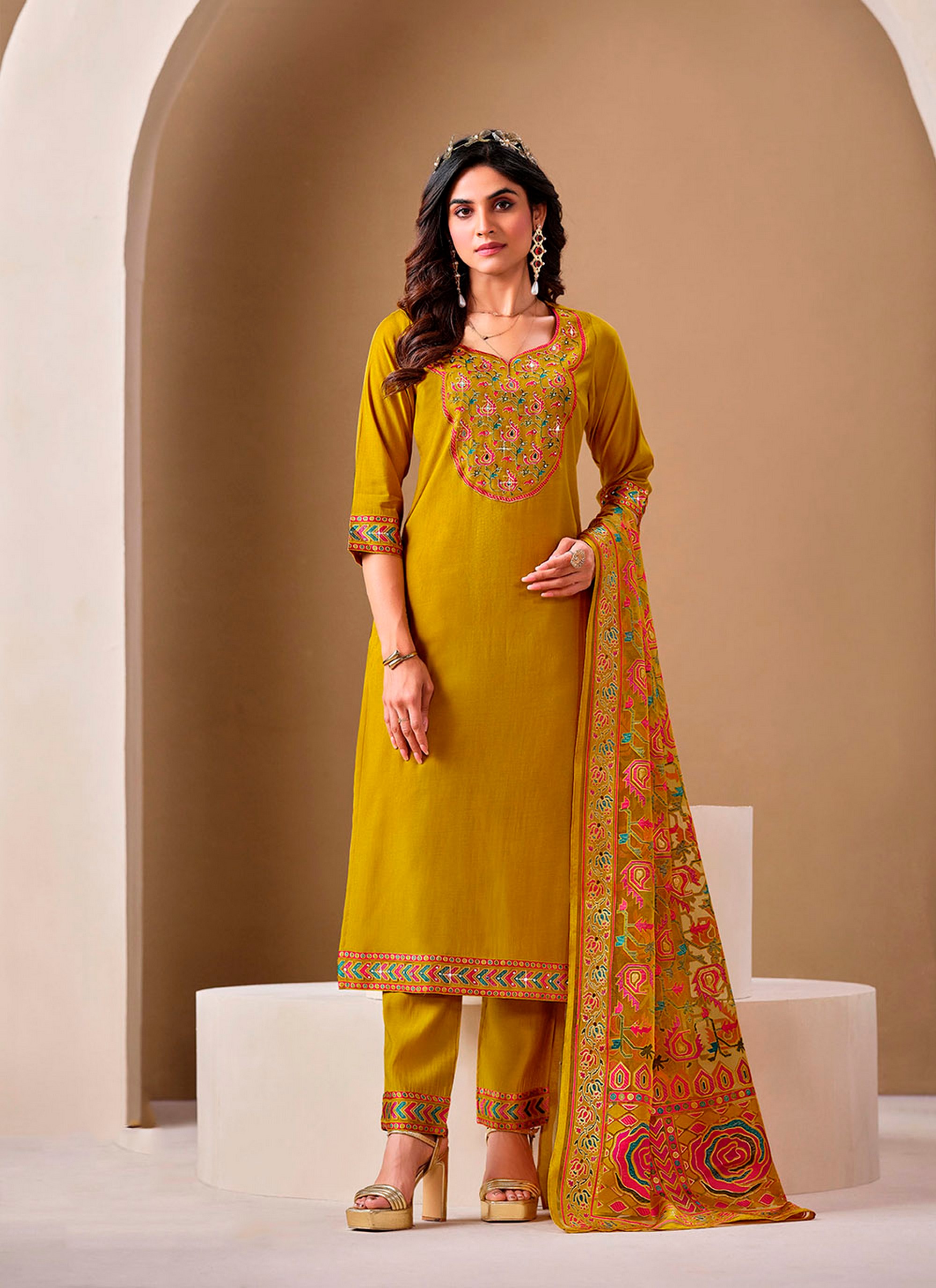 Mustard Color Roman Silk Fabric Bollywood Style Ceremonial Wear Salwar Kameez