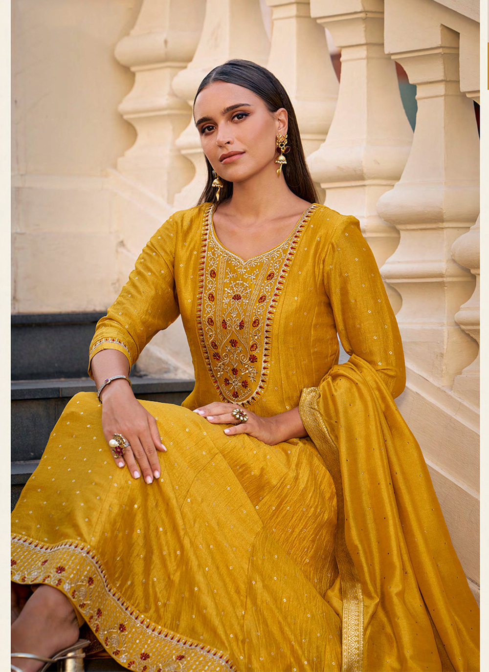 Mustard Color Vichitra Silk Fabric Heavy Embroidered Readymade Suit