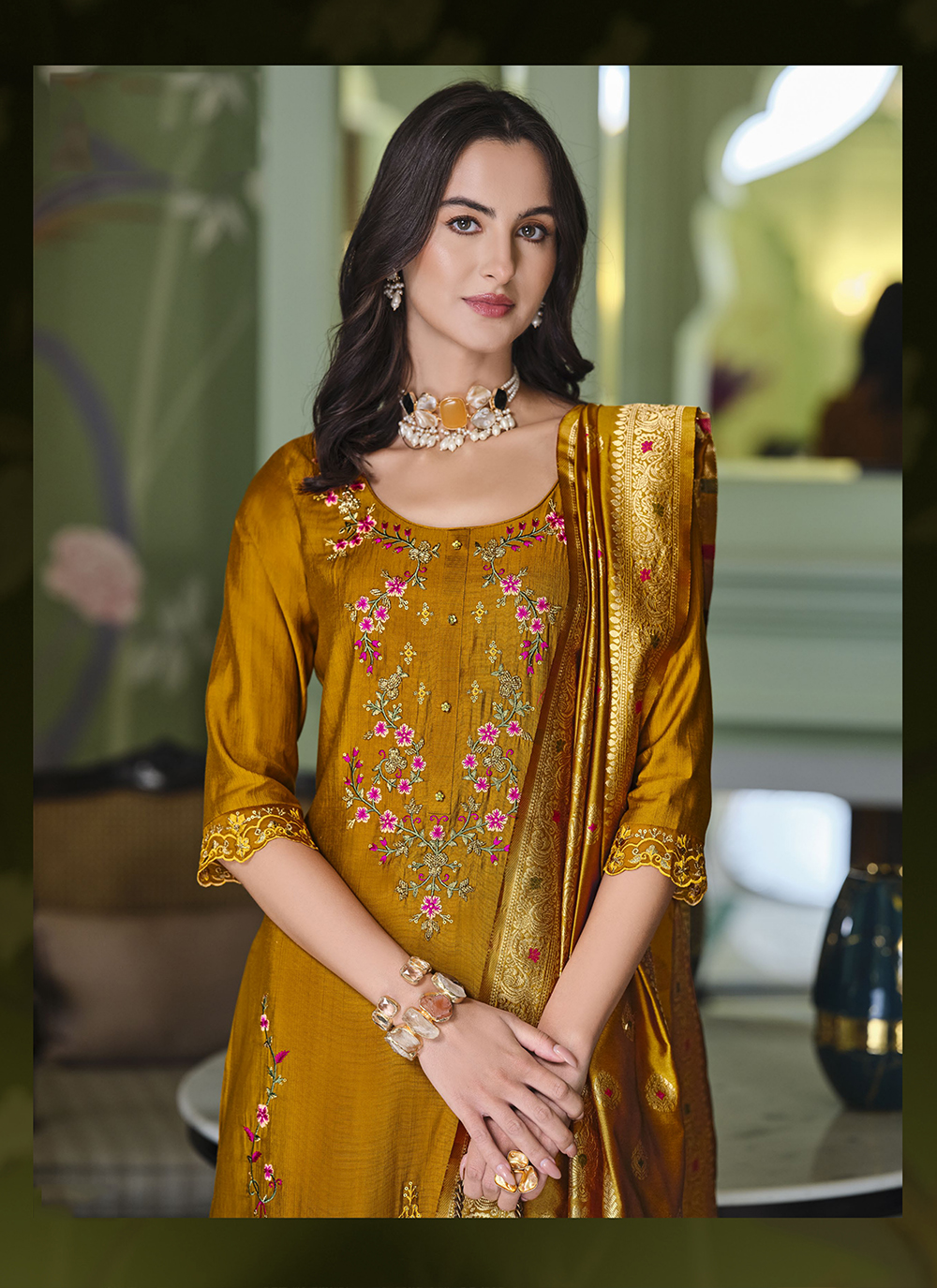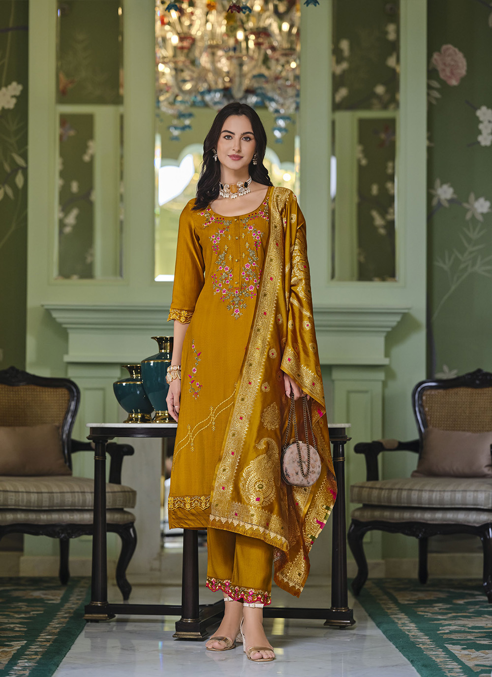 Mustard Color Viscose Fabric Woven Designer Readymade Suit With Hand Work