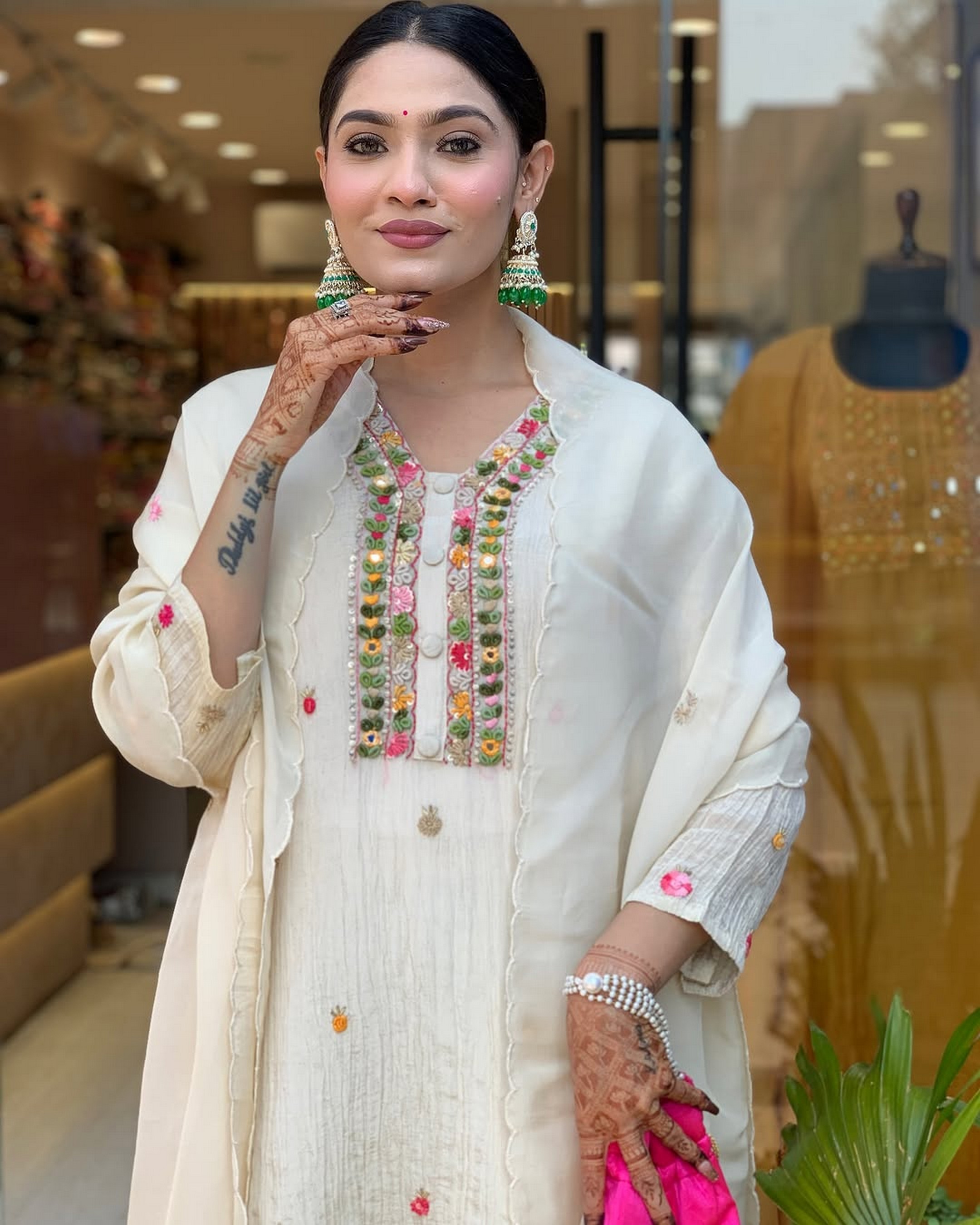 Off White Color Chinon Fabric Beautiful And Ethnic Readymade Kurta Set