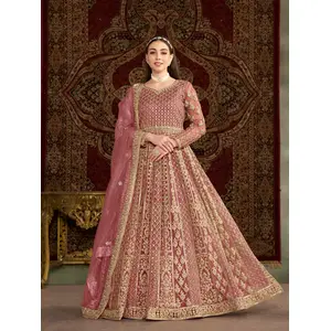 Peach Embroidered Net Semi Stitched...