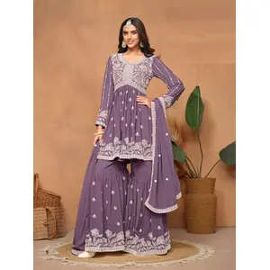 Purple Embroidered Faux Georgette...