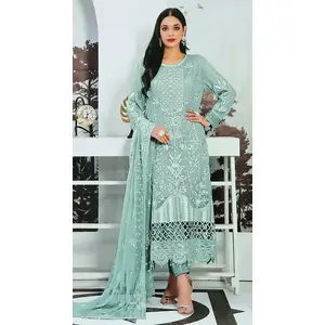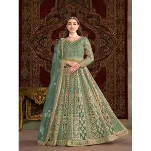 Green Embroidered Net Semi Stitched...