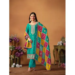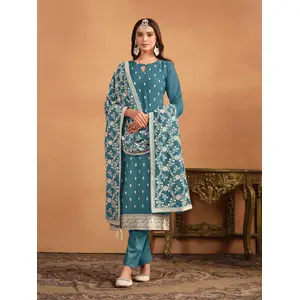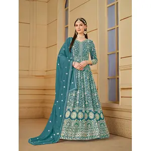 Teal Embroidered Faux Georgette Semi...