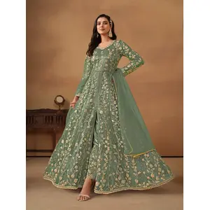 Green Embroidered Net Semi Stitched...