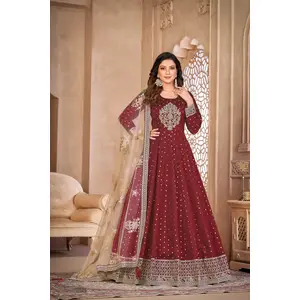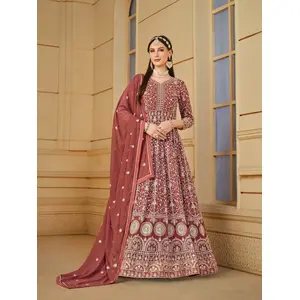 Brown Embroidered Net Semi Stitched...