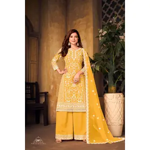 Yellow Embroidered Net Semi Stitched...