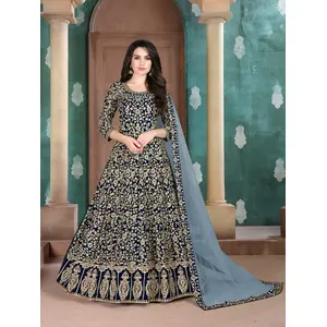 Navy Blue Embroidered Faux Georgette...