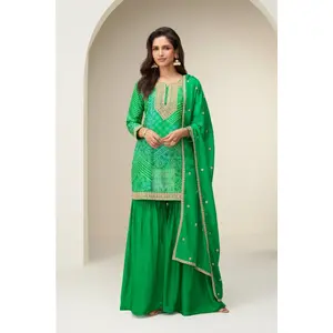 Green Chinon Semi Stitched Suit with...