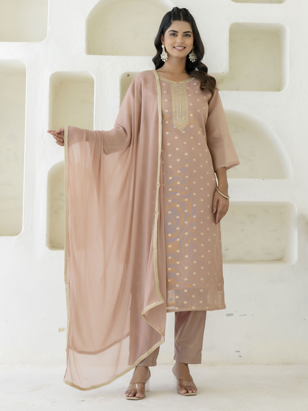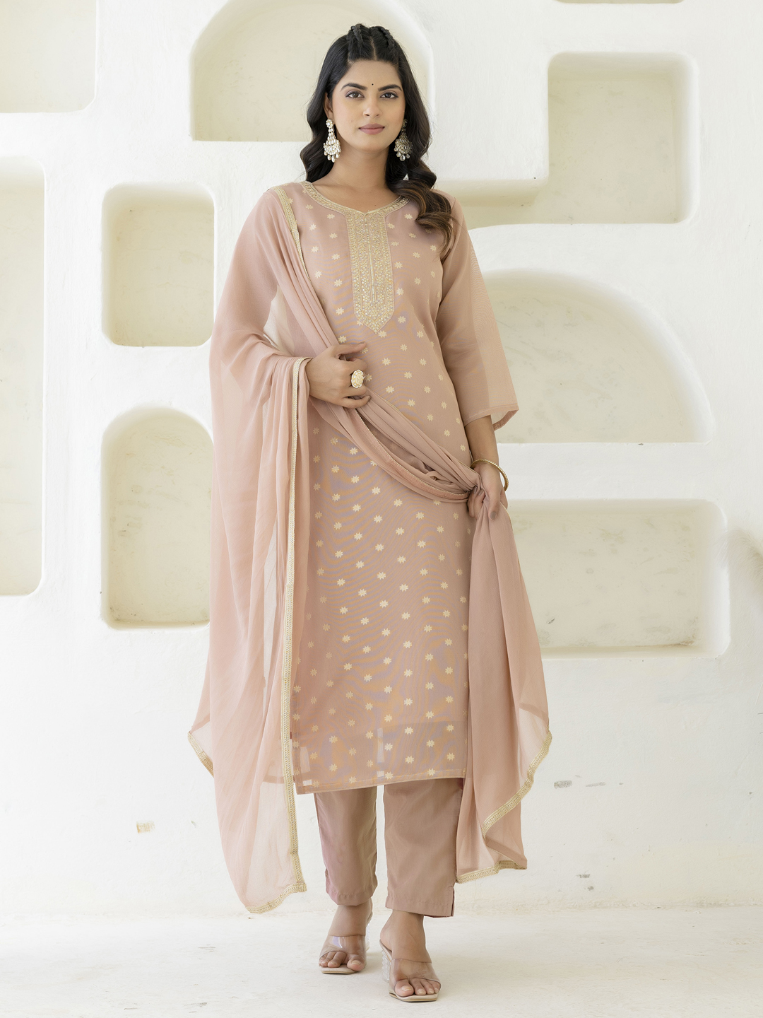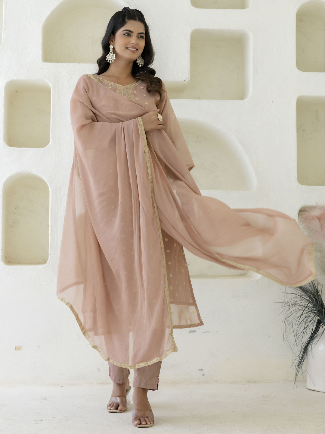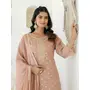 Peach Color Chanderi Silk Fabric Designer Embroidery Work Formally Ethnic Readymade Kurta Set