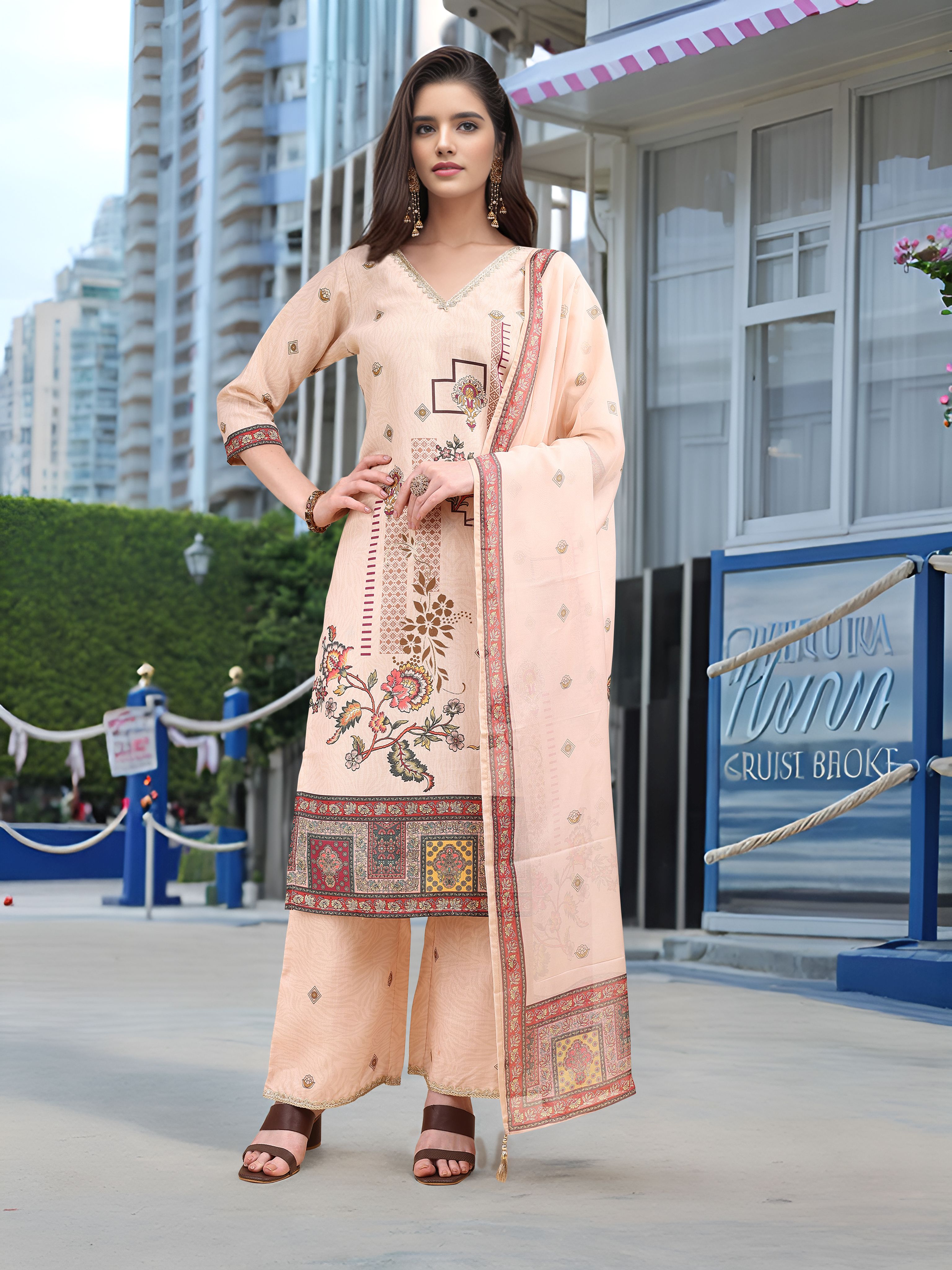 Peach Color Linen Fabric Digital Printed Ethnic Readymade Suit For Trendy Looks
