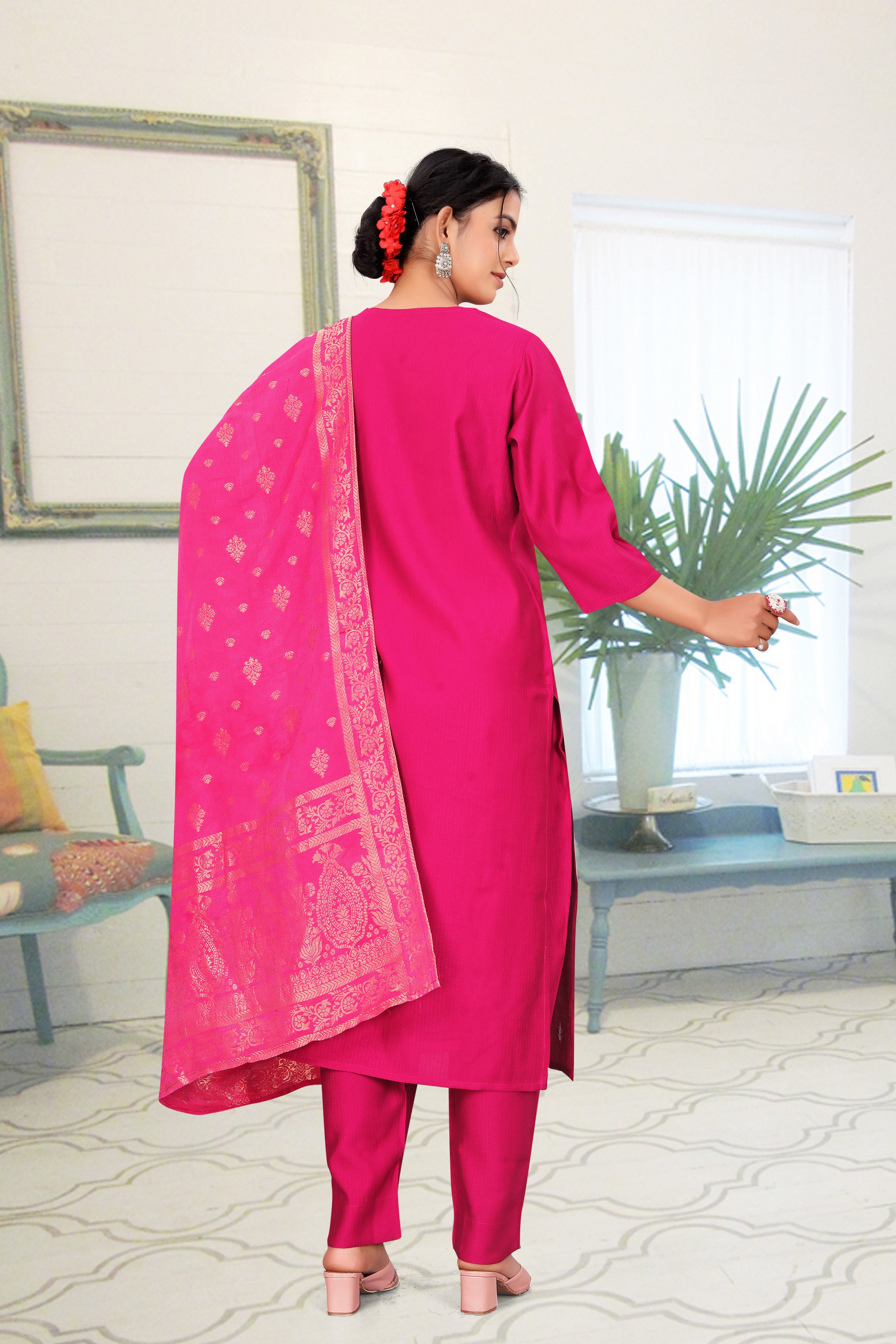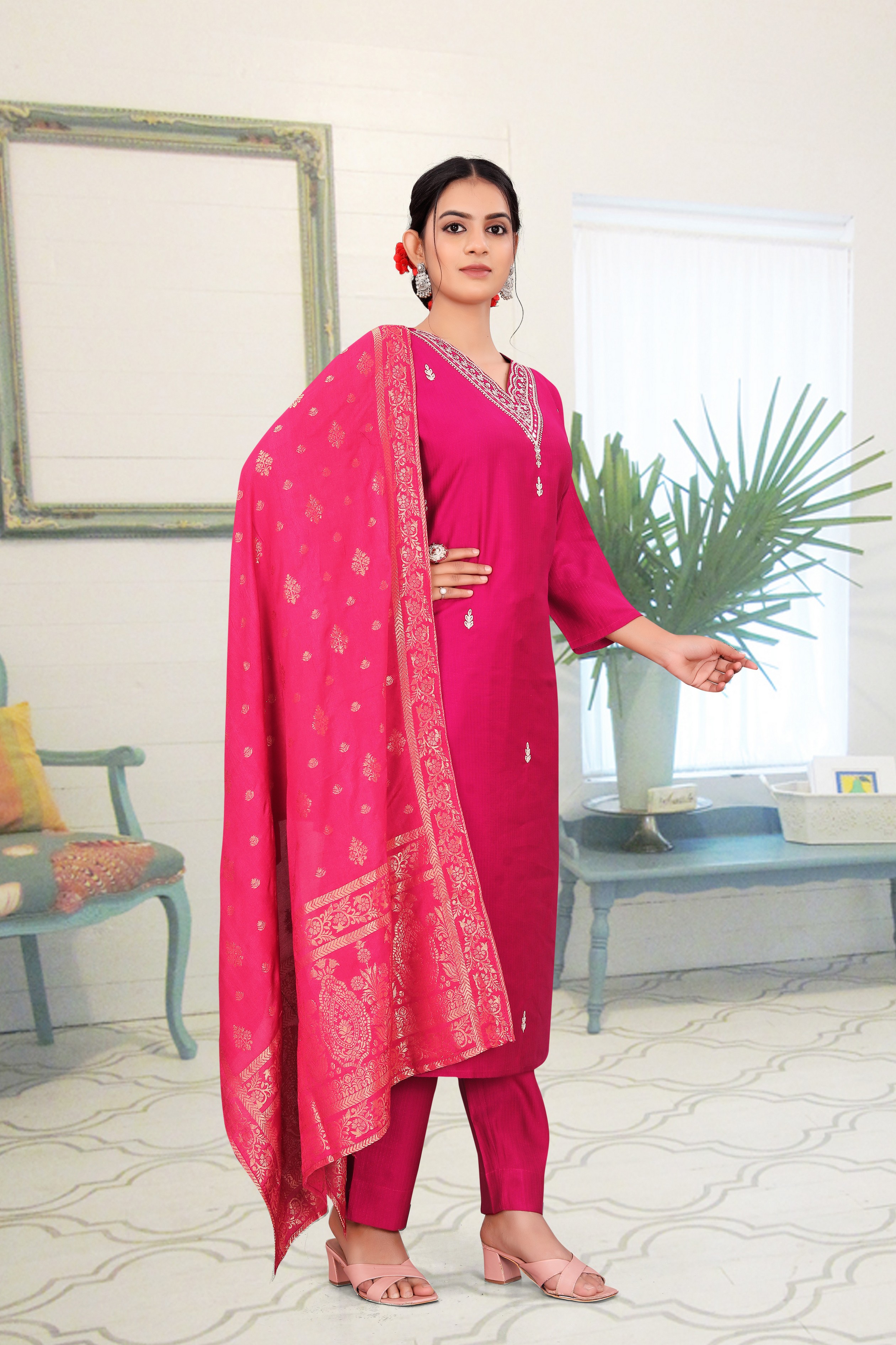 Attrective These Suit in Fine Colored Pair With Bottom And Dupatta.These Top And Bottom Are Fabricated On Vetican Pair With Muslin Banarasi Dupatta.Its Beautified With Designer Dori Embroidery Work.