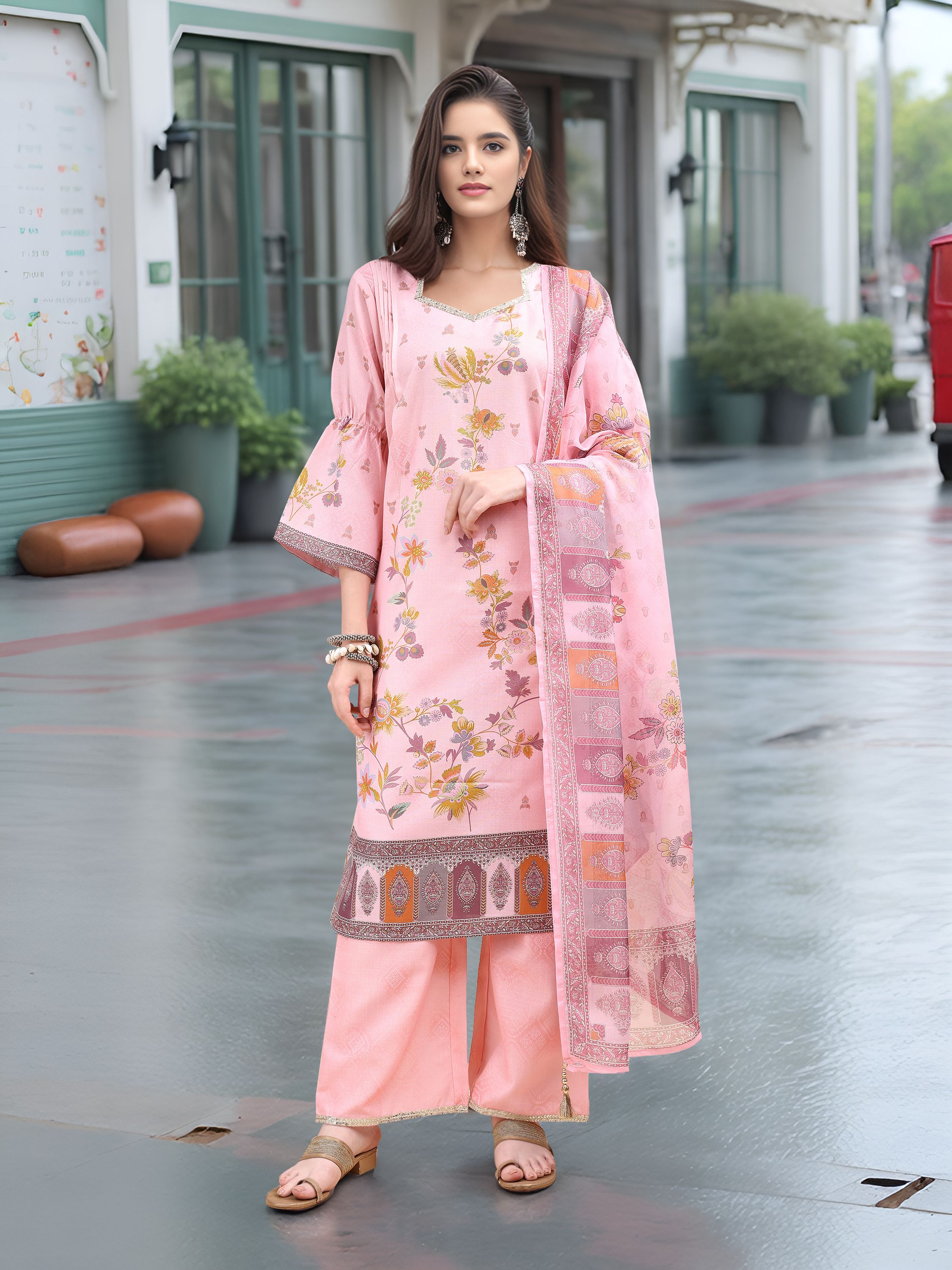 Pink Color Linen Fabric Digital Printed Ethnic Readymade Suit For Trendy Looks