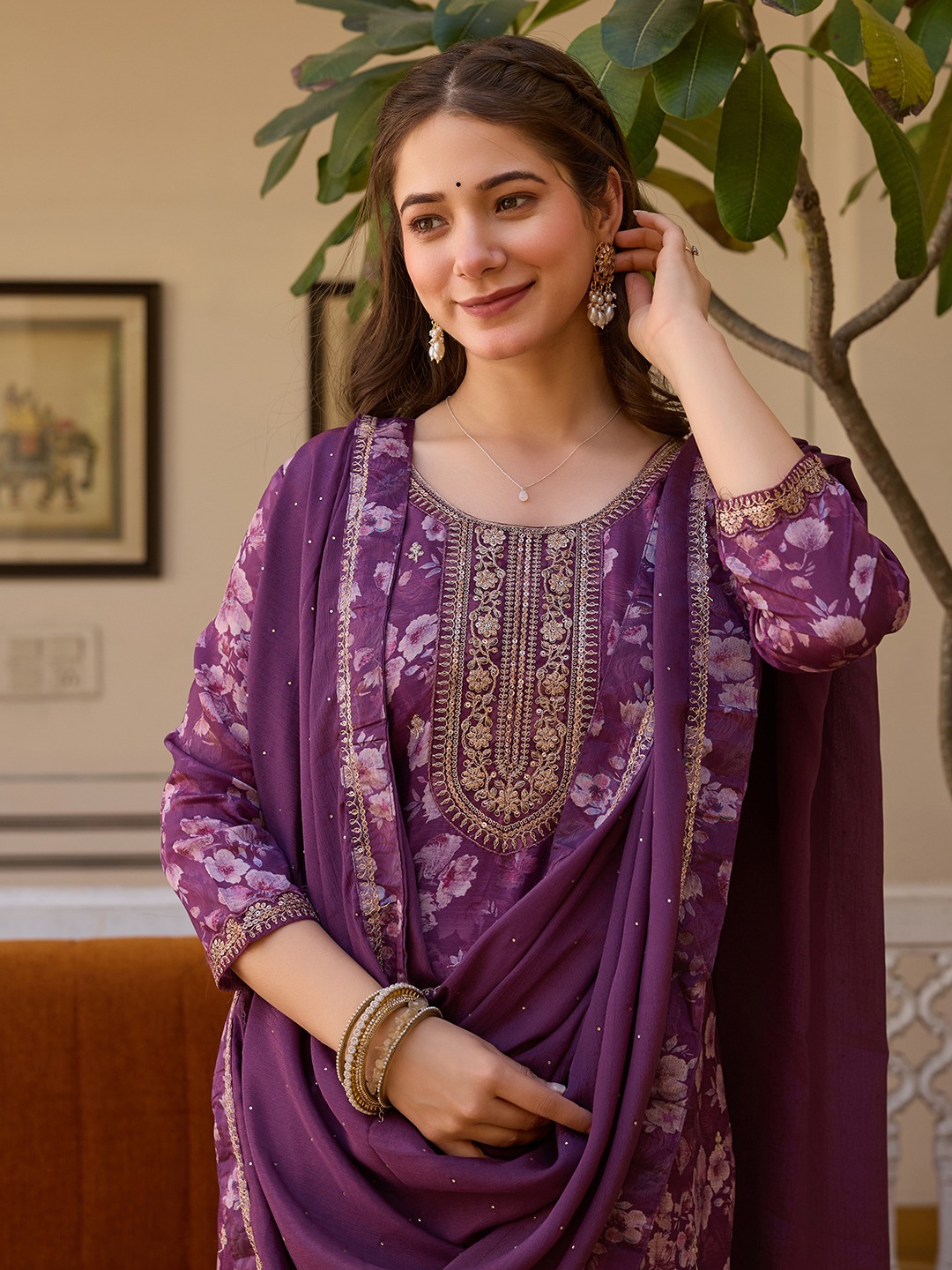 Purple Color Beautiful Ceremonial Chinon Fabric Embroidered Festive Suit