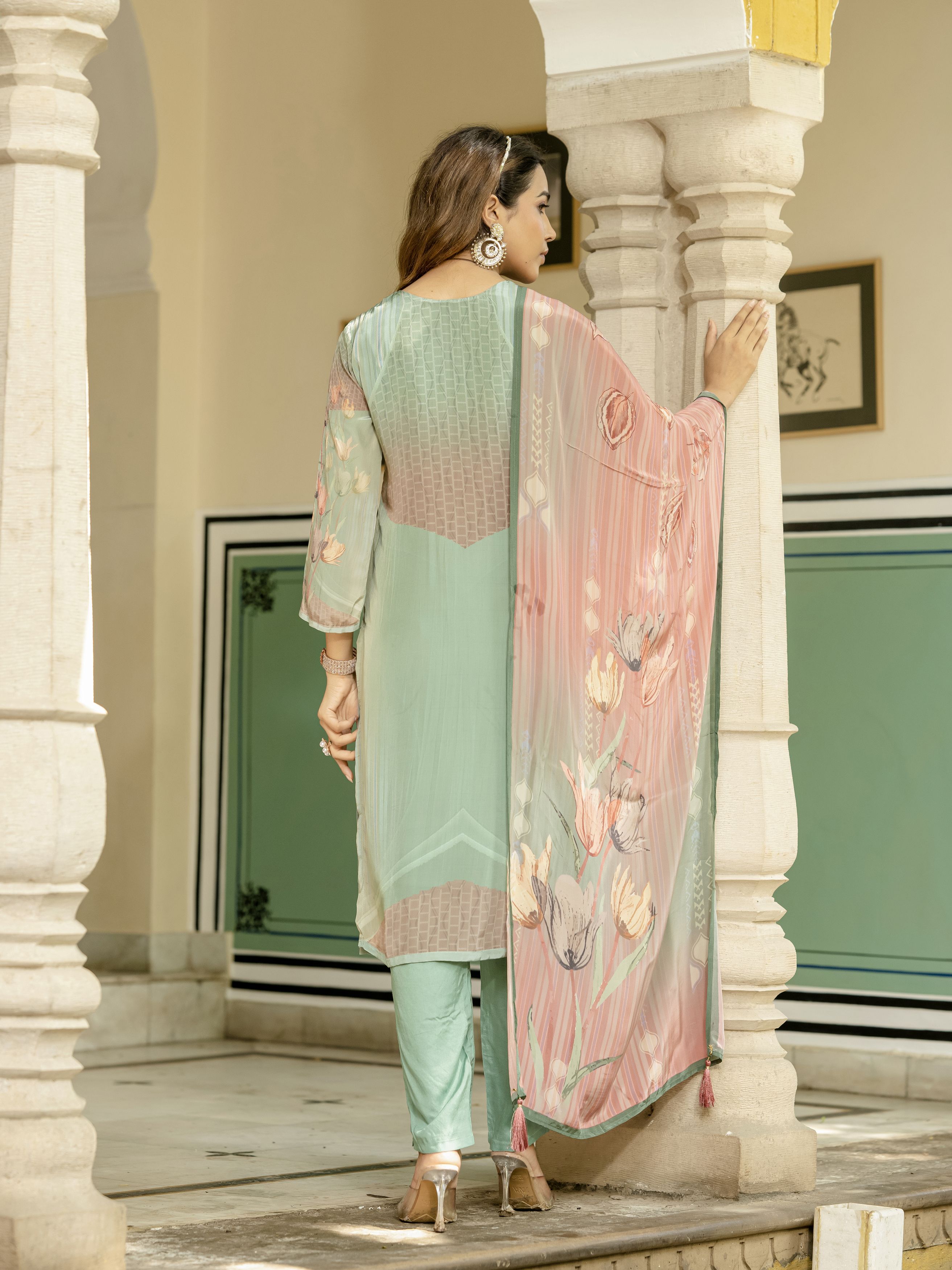 Sea Green Color Beautiful Natural Crepe Fabric Readymade Stylish Ethnic Suits For Girls