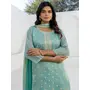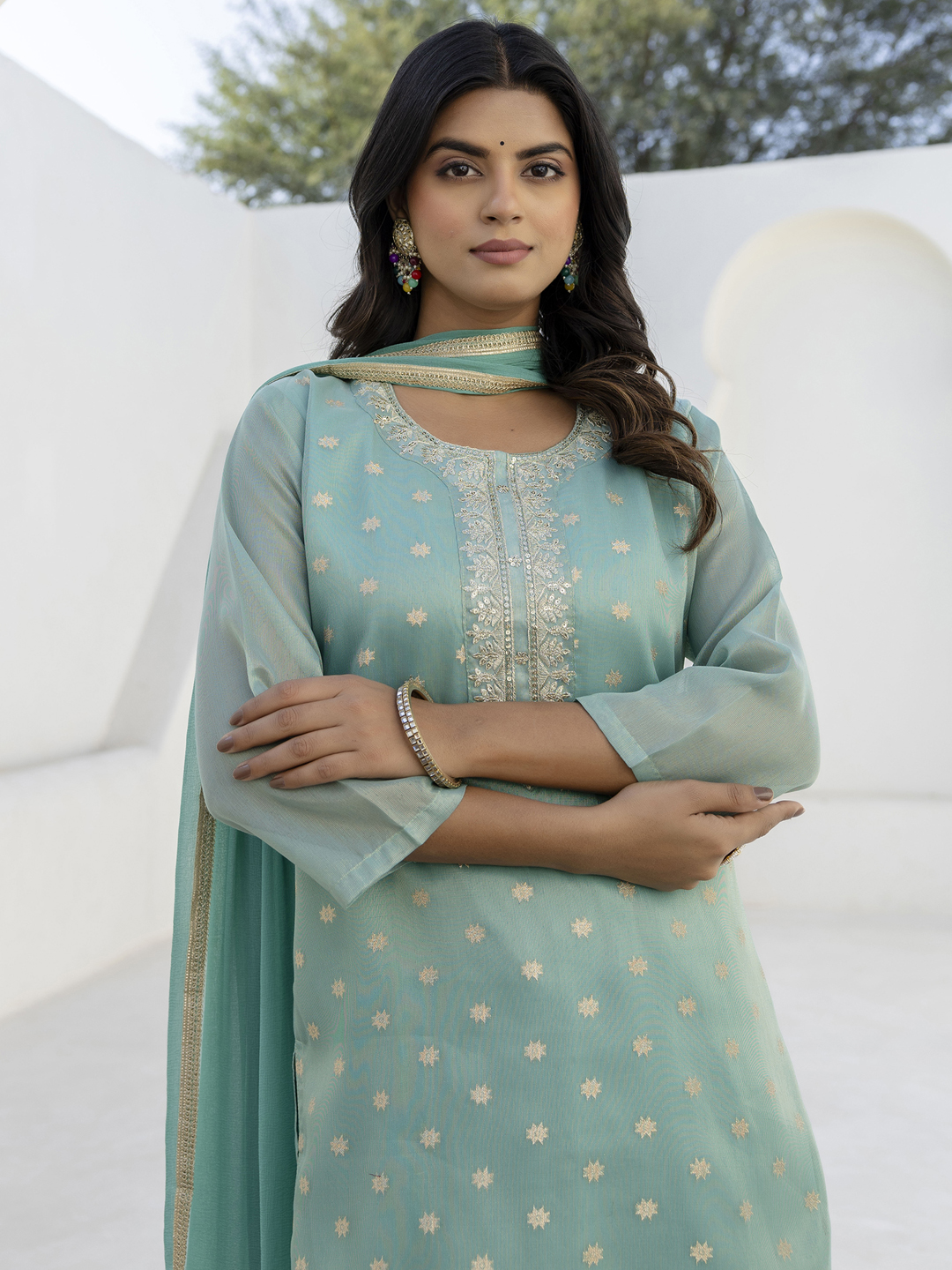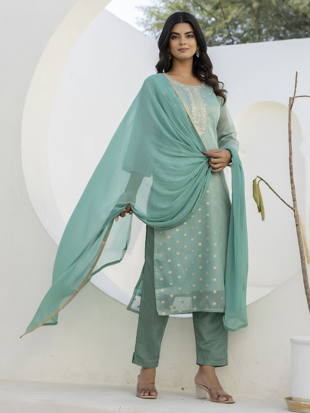 Sea Green Color Chanderi Silk Fabric Designer Embroidery Work Formally Ethnic Readymade Kurta Set