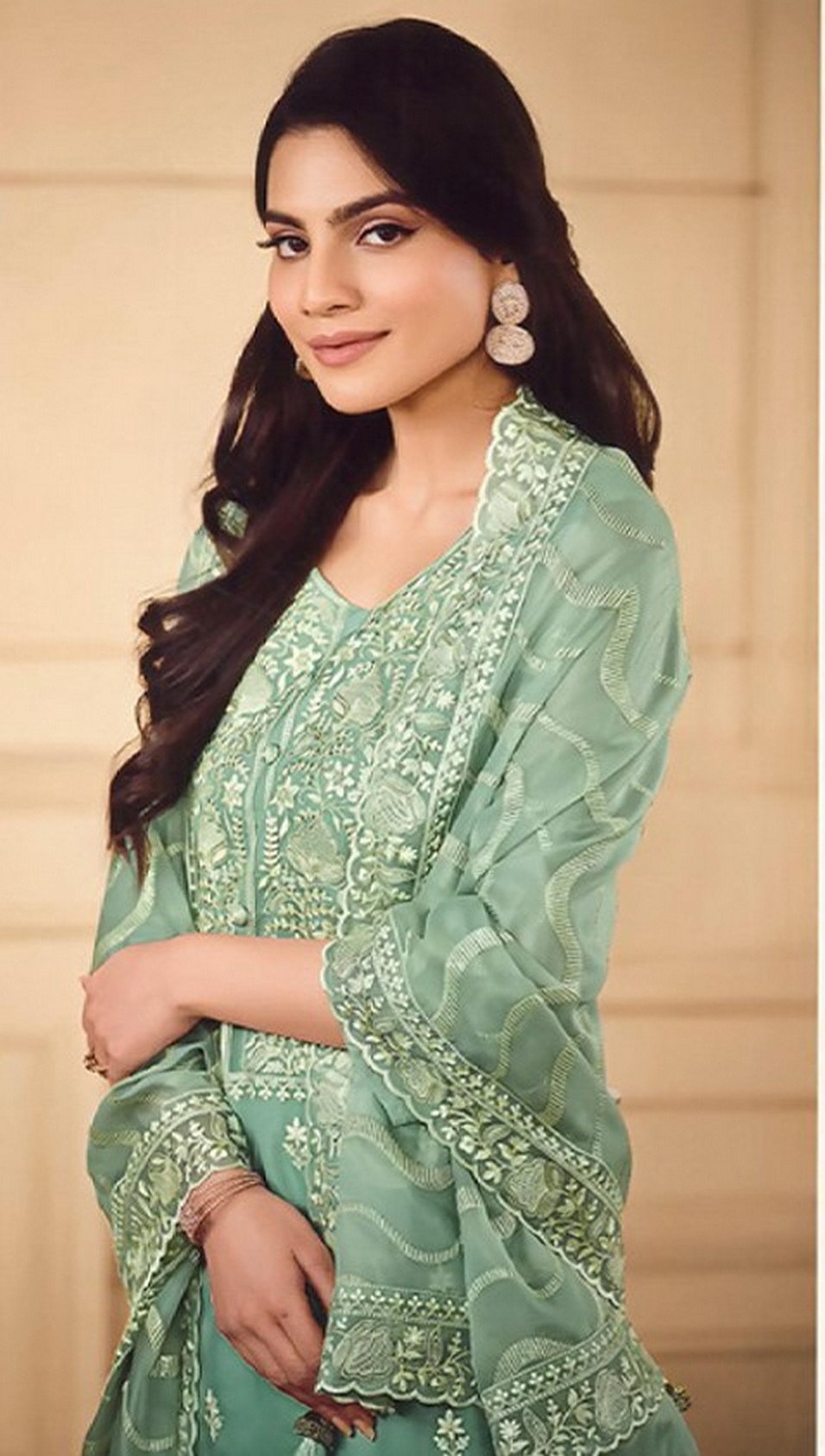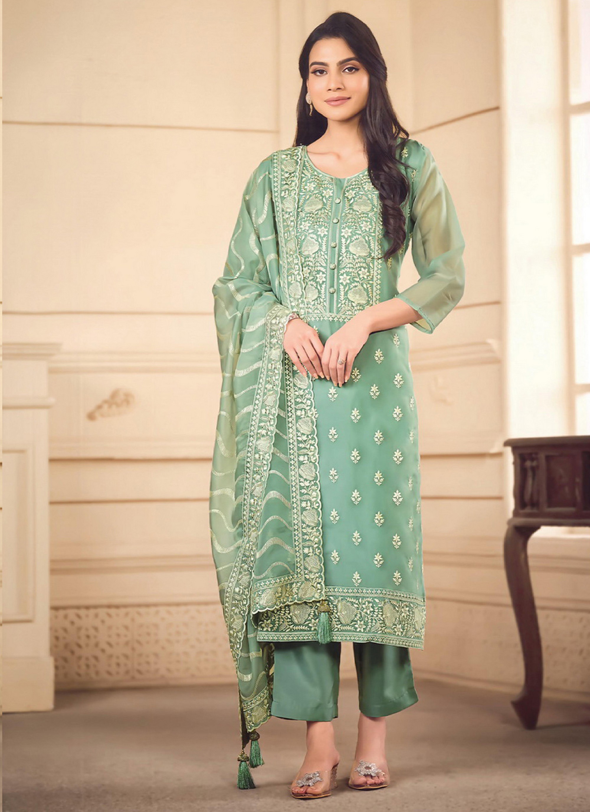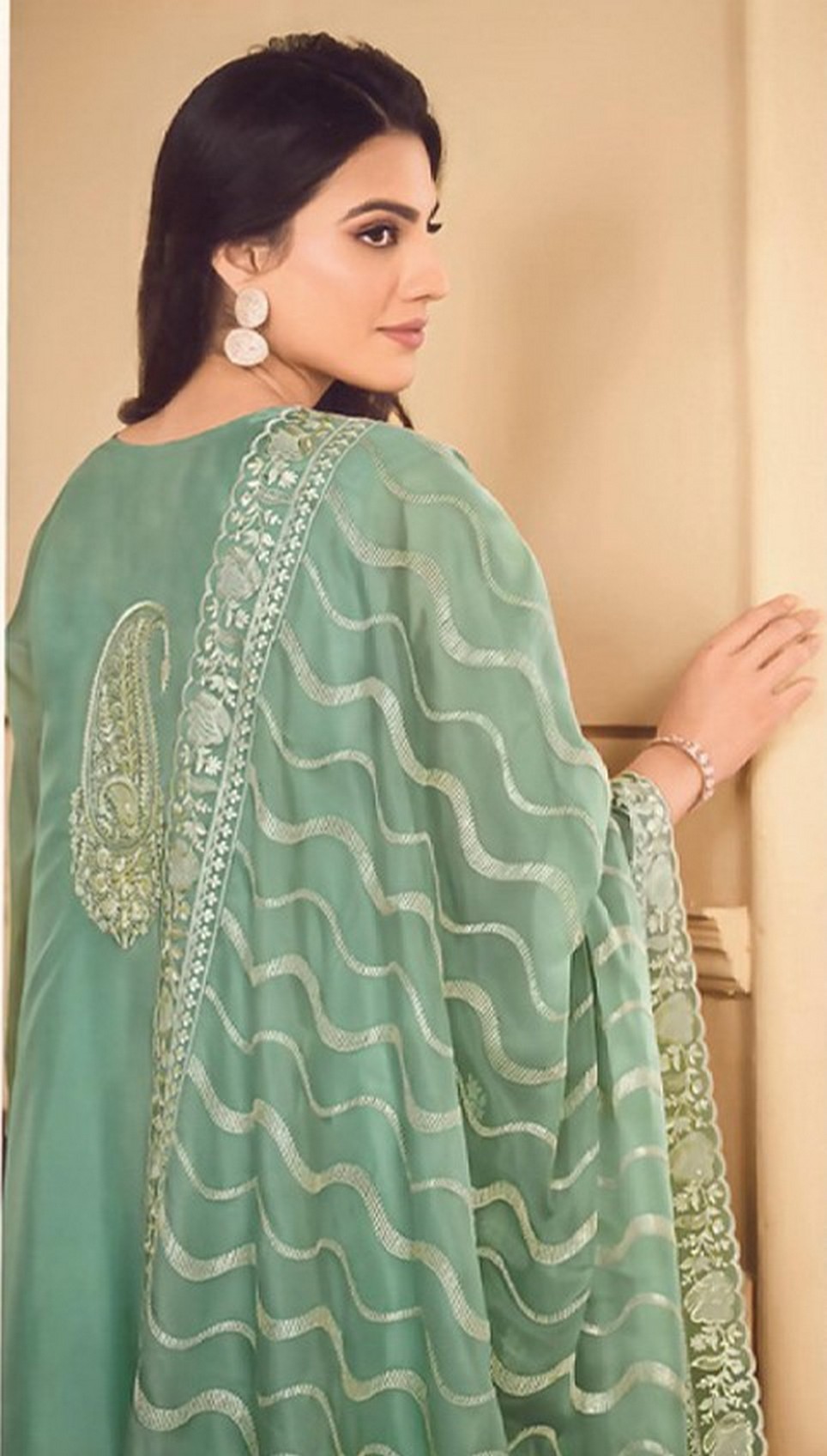 Sea Green Color Elegant Organza Fabric Designer Embroidered Suit