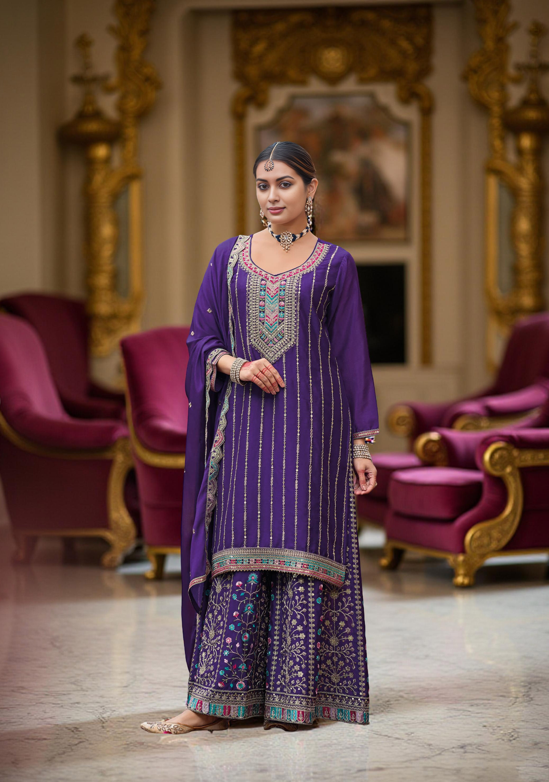 Violet Color Chinon Fabric Designer Embroidery Work Graceful Palazzo Dress