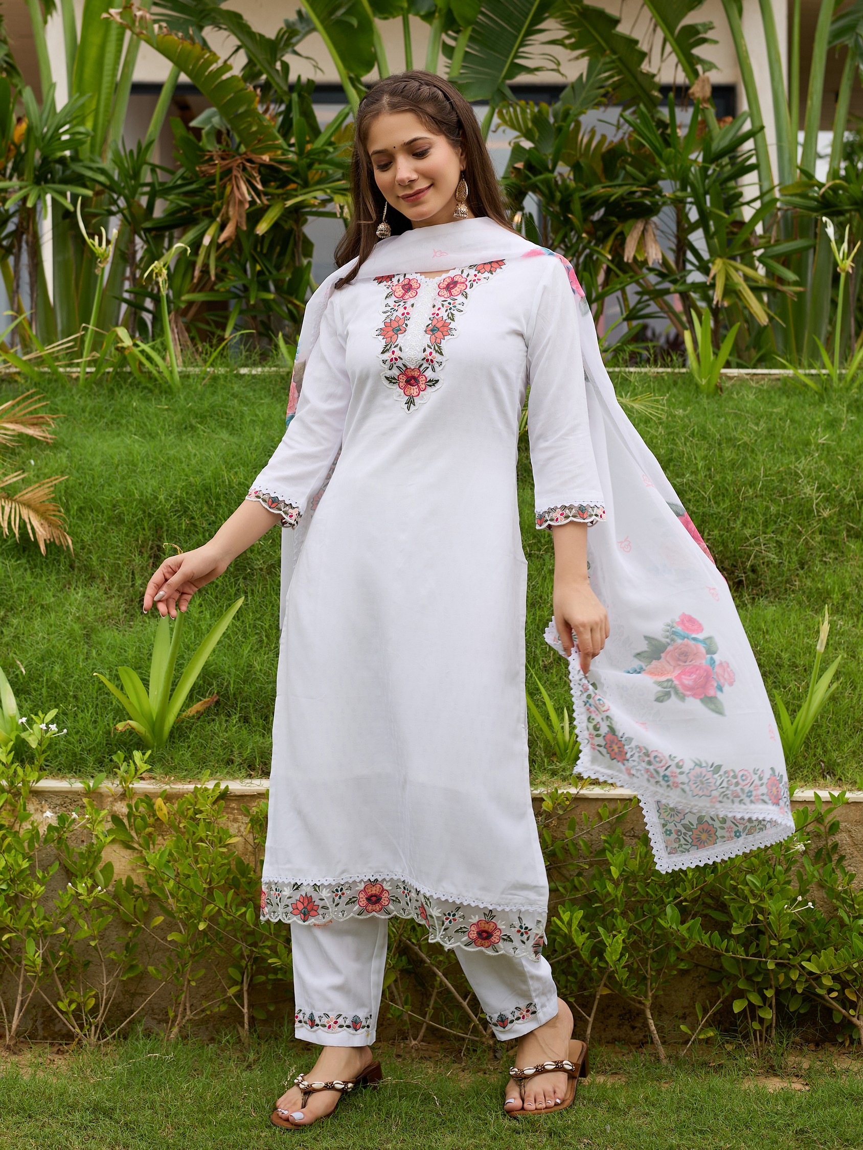 White Color Viscose Fabric Designer Embroidered Readymade Kurta Set With Dupatta