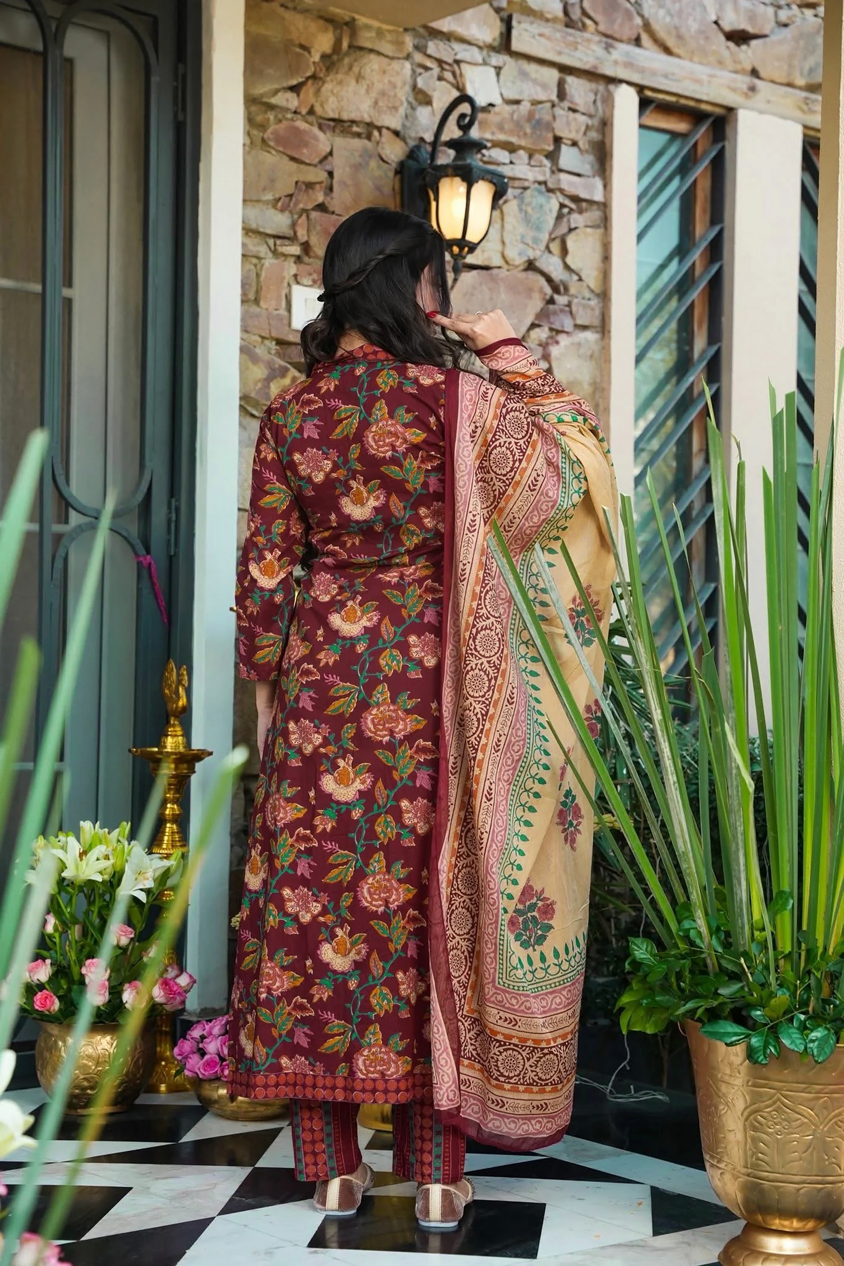 Wine Color Beautiful Printed Muslin Fabric Readymade Palazzo Dress