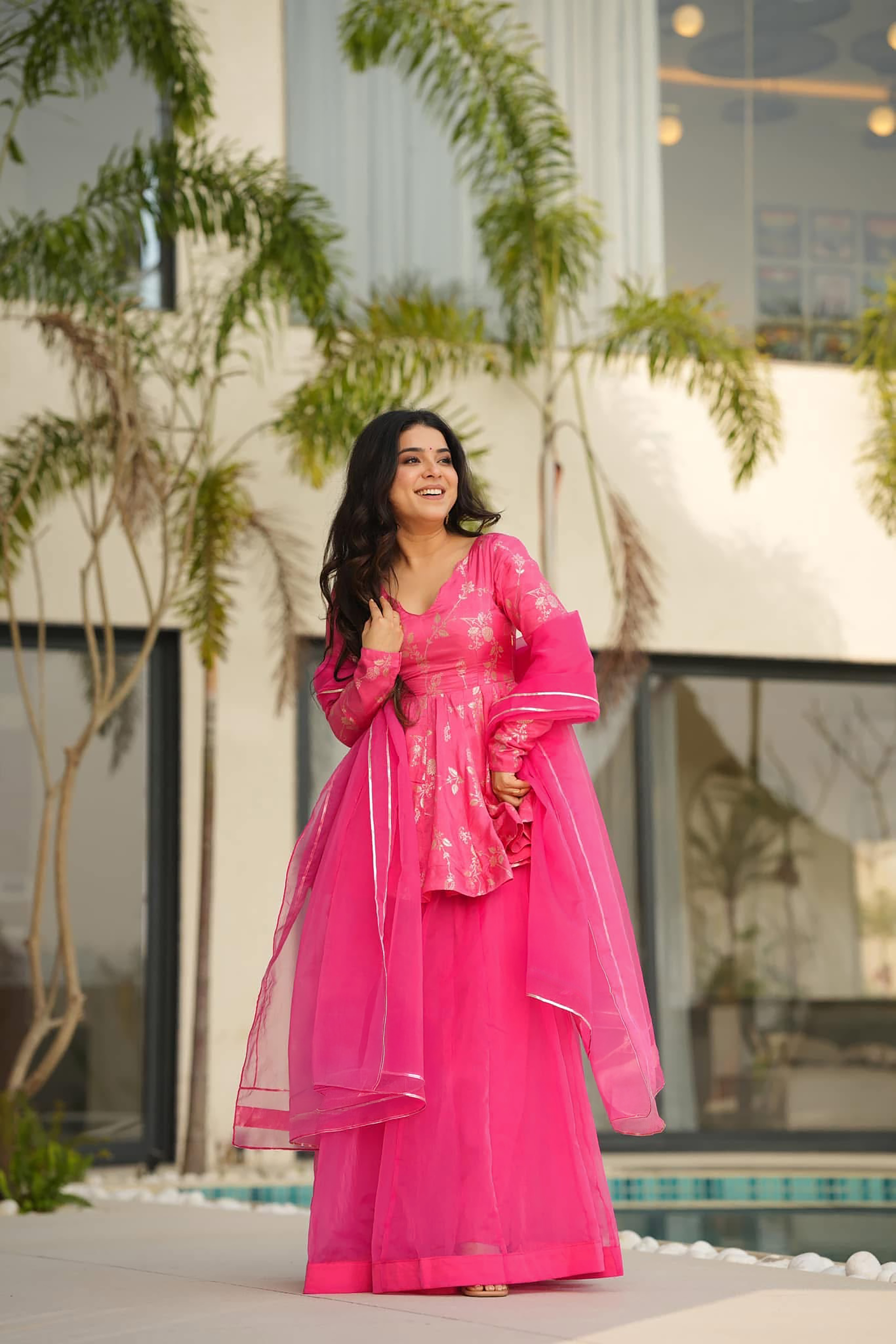 Enhance your festive wardrobe with this elegant sharara set paired with a matching dupatta. Designed for comfort and style, this readymade ensemble features a graceful silhouette and ethnic appeal, making it perfect for festive celebrations, family functions, and special occasions.