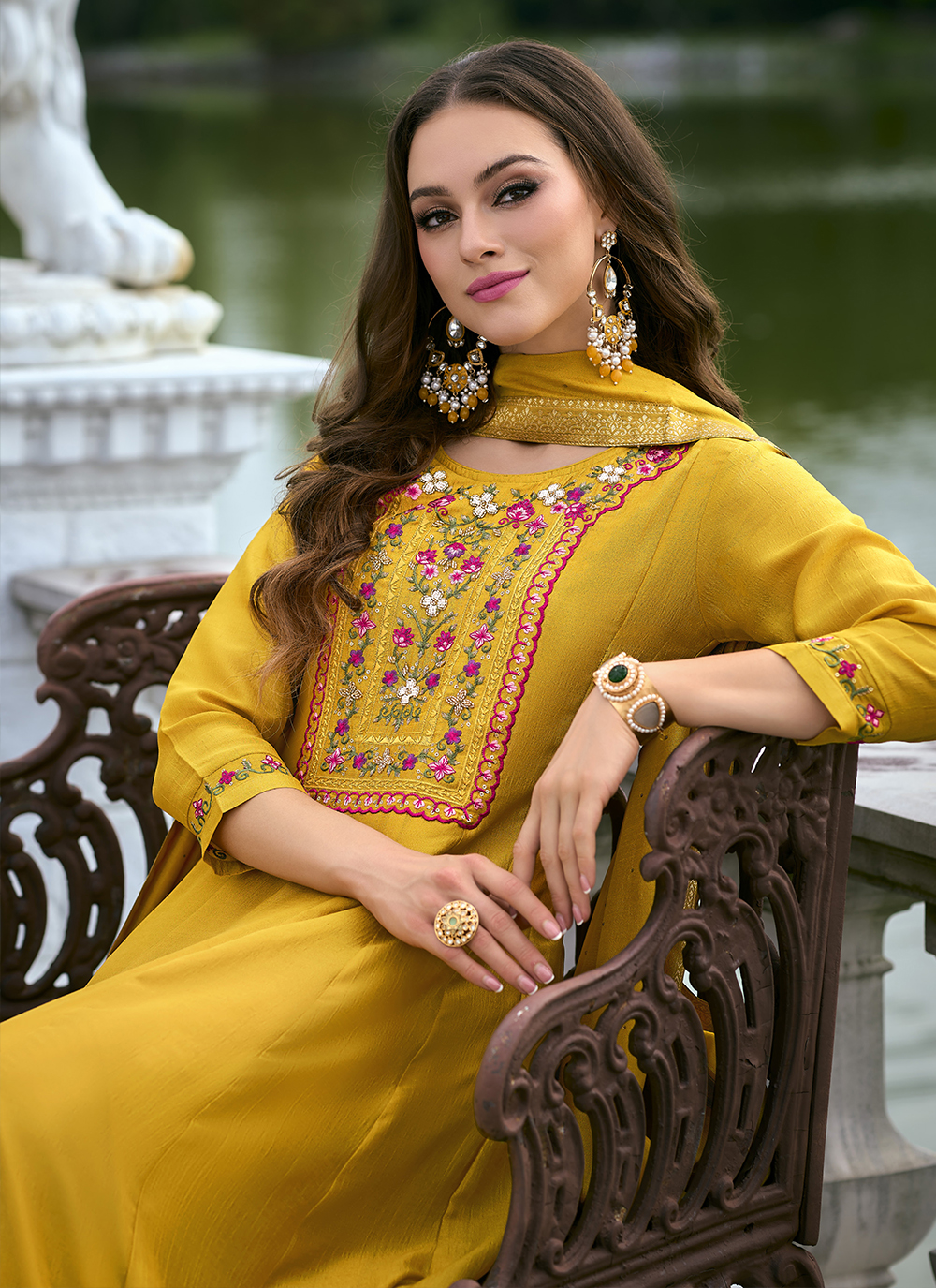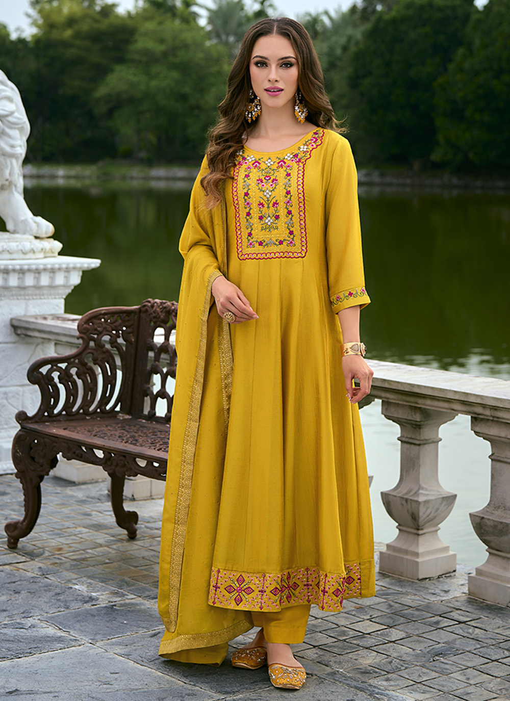 Yellow Color Vichitra Silk Fabric Stitched Salwar Kameez For Ceremonial Looks