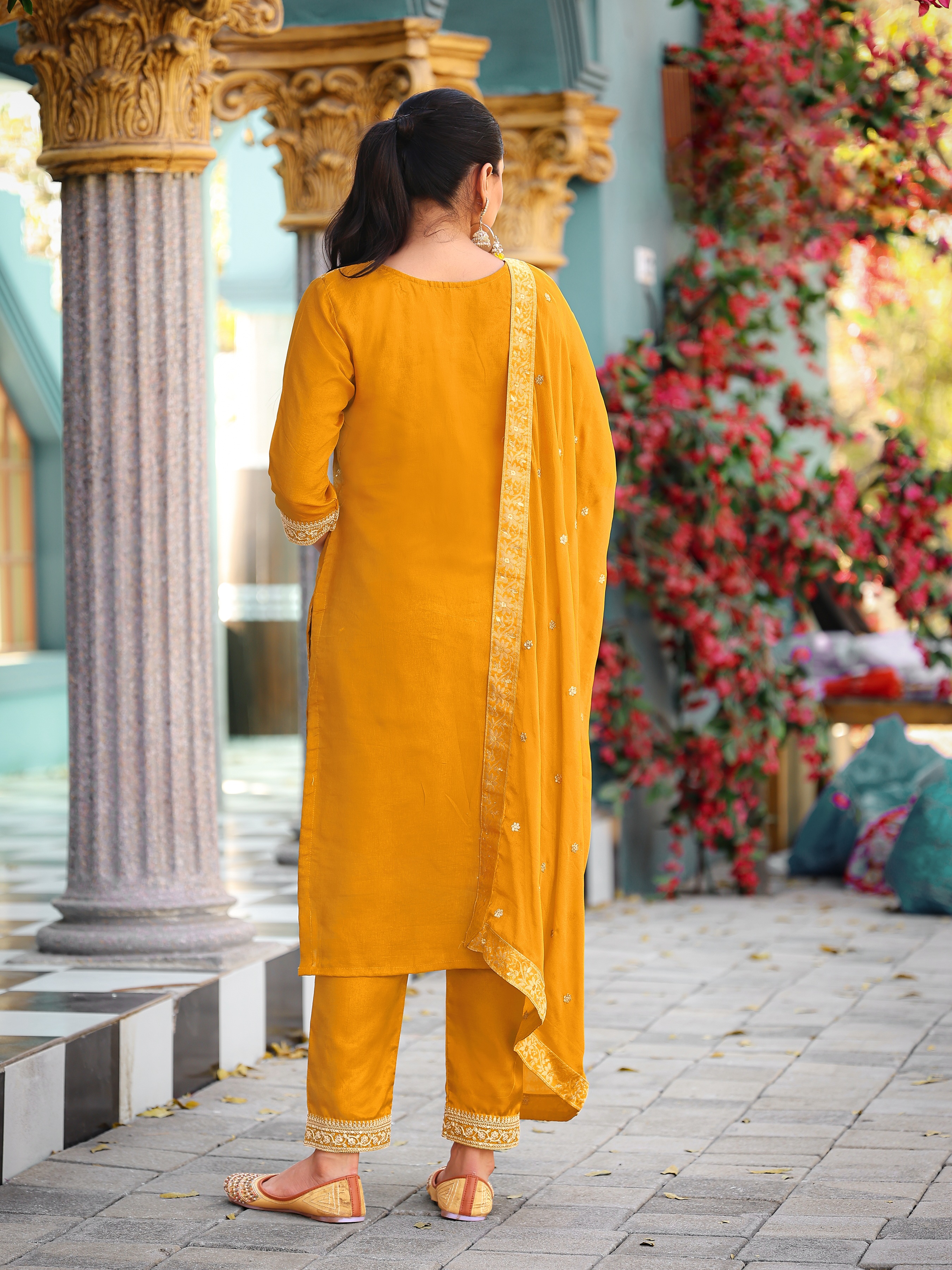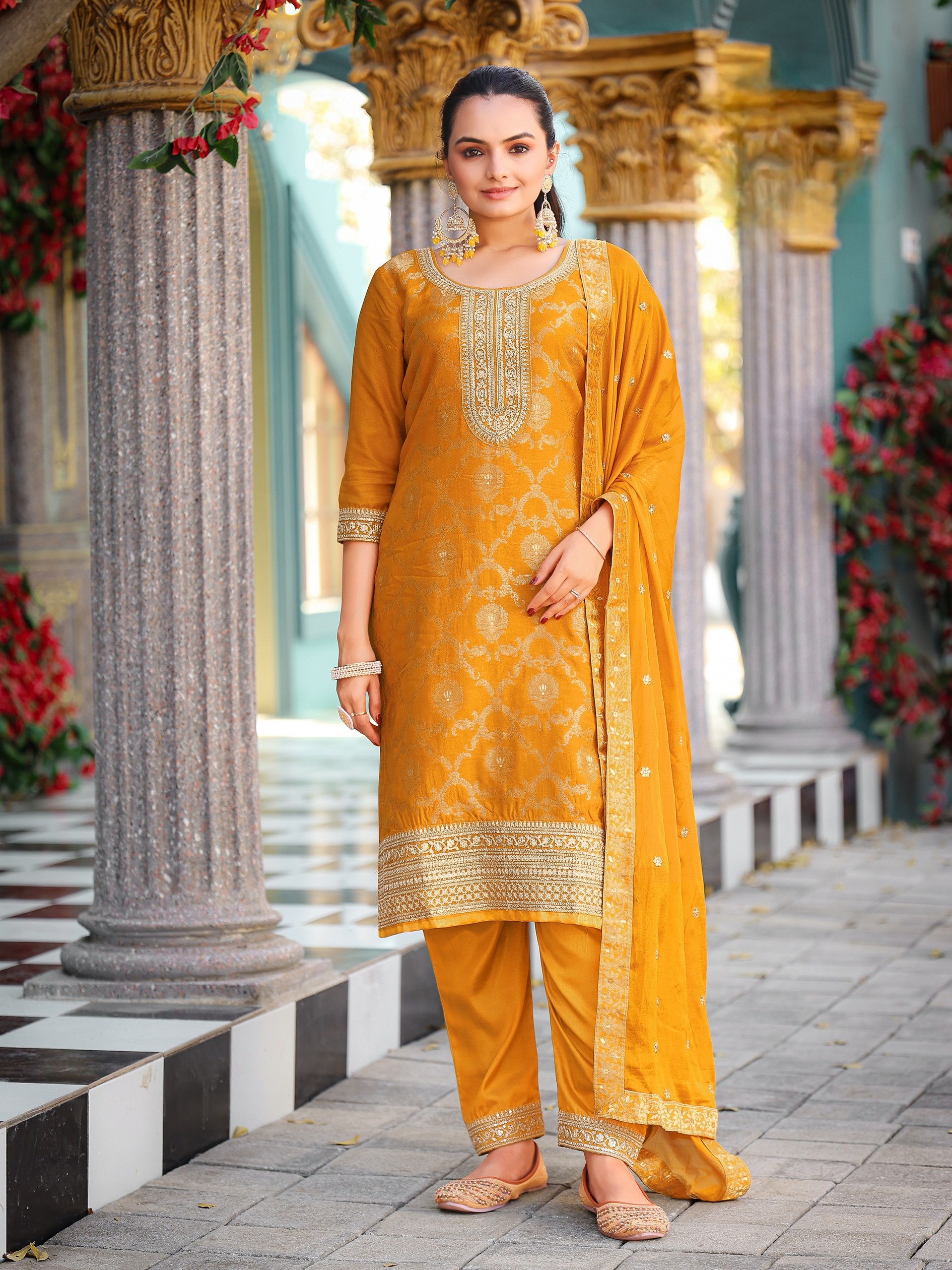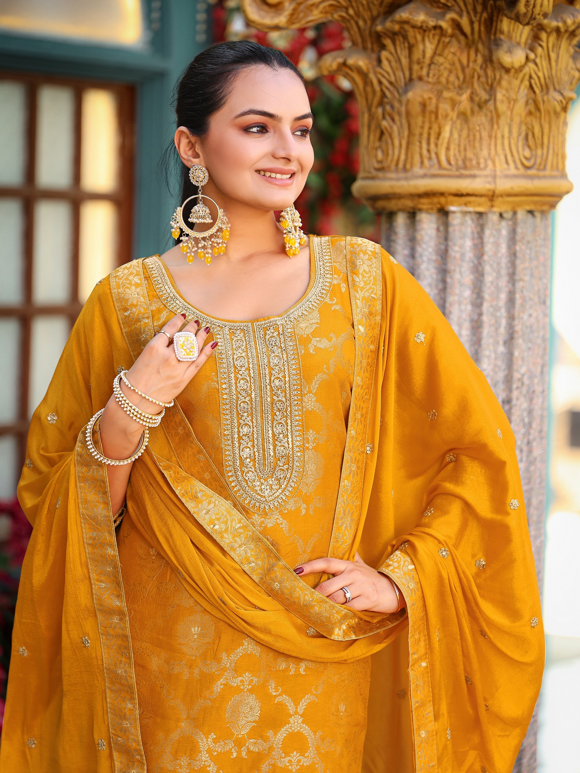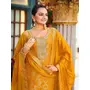 Yellow Color Viscose Jacquard Woven Designer Embroidered Heavy Partywear Suit
