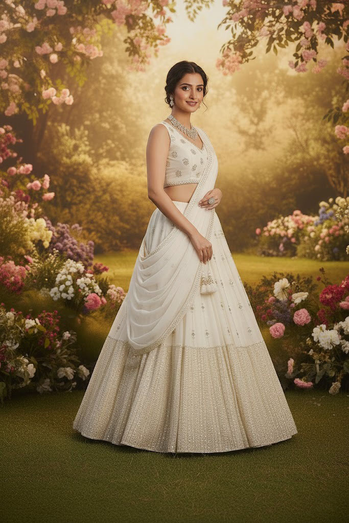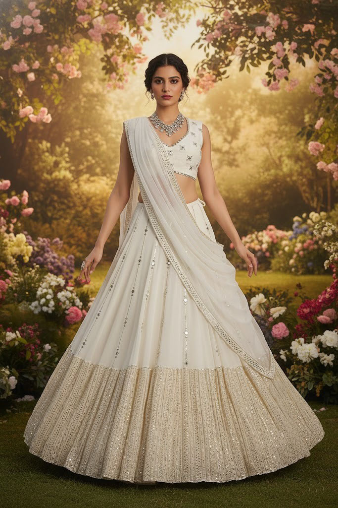 LEHENGA(BOTTOM)FABRIC:- GEROGETTEINNER:- MICROWORK:- 3MM 5MM SEQUINS WITH JARI AND PAPER MIRROR EMBROIDERY WORKSTITCH:- SEMI STITCHED(WITH KENKEN AND KENVAS)SIZE:- 42HEIGHT AND 42 TO 44 WAISTFLAIR:- 4.20 METER FLAIRCHOLI(TOP)FABRIC:- GEORGETTEBLOUSE SIZE:- 1 METER FABRICWORK:- JARI WITH PAPER MIRROR EMBROIDERY WORK STITCH:- UN STITCHED FABRIC WITH INNER FABRICSDUPATTAFABRIC:- GEORGETTEWORK:- 3MM5MM SEQUINS LACE BORDER EMBROIDERY WORKSIZE:- 2.25 METER DUPATTASTITCH:- FULL STITCHEDADDITIONALWASH CARE: - DRY CLEAN ONLYCOLOR: - PRODUCT COLOR MAY SLIGHTLY VARY DUE TO PHOTOGRAPHIC LIGHTNING SOURCES OR YOUR DEVICE DISPLAY SETTINGSTHESE ARE MADE TO ORDER DESIGNER STYLES, HENCE EXPECT A SLIGHT VARIATION FROM THE IMAGE DISPLAYEDIN THE BOX 1 PIECE LEHENGA 1 PIECE DUPATTA 1 PIECE BLOUSE FABRIC (1 SET OF HAND MADE TASSELS)ALTERNATIVEHANDMADE TASSELS MAY DIFFER FROM THE PHOTOS AND VIDEOS. TASSELS WILL BE AVAILABLE AS LONG AS THE CURRENT STOCK LASTS. ALTERNATIVELY, NEW STOCK MAY TAKE SOME TIME TO ARRIVE. WE ARE NOT STRICTLY BOUND TO PROVIDE TASSELS.