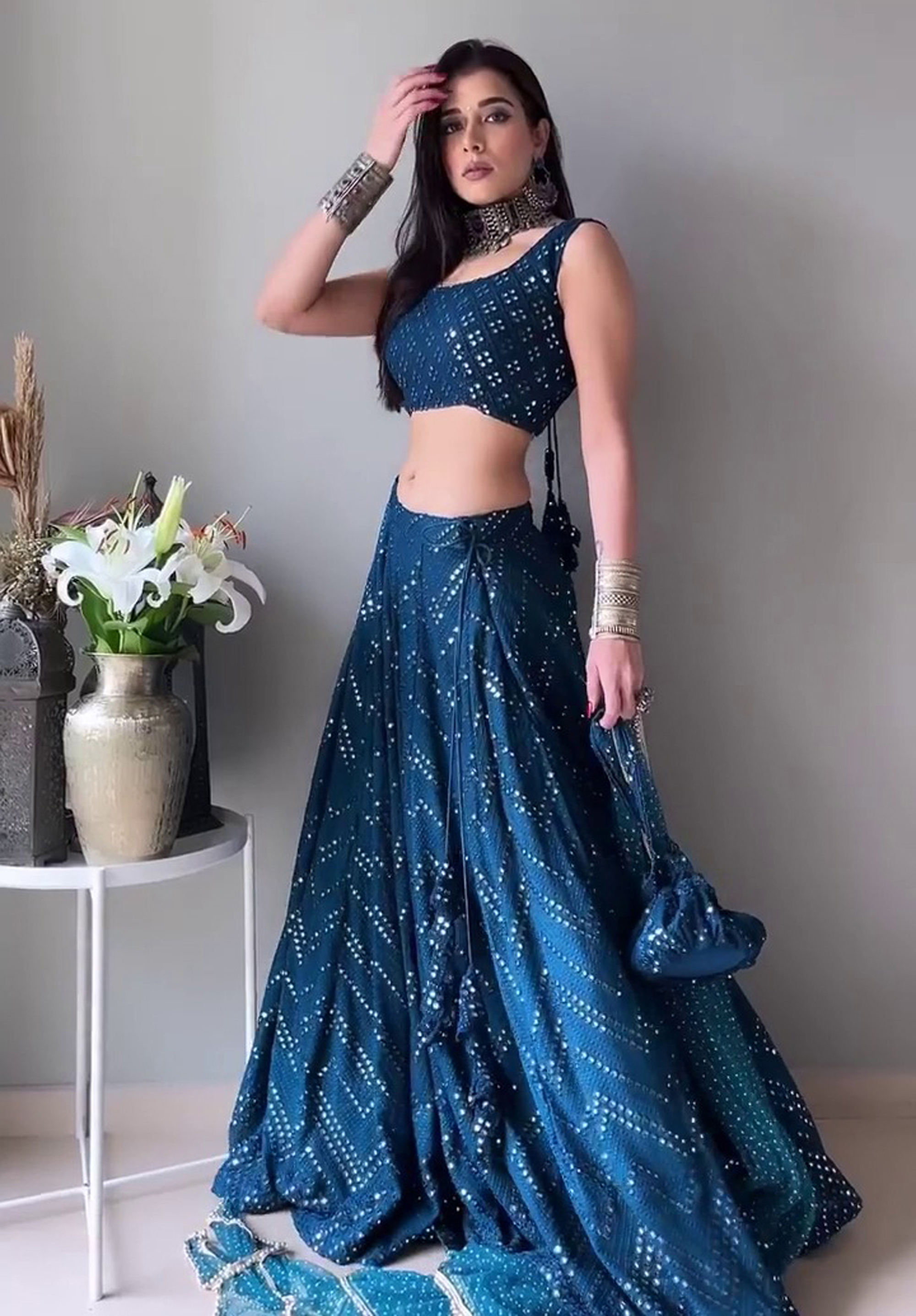 LEHENGA(BOTTOM)FABRIC: - FAUX GEORGETTEINNER: - MICRO FABRICWORK: - 3MM SEQUINS WITH THREAD EMBROIDERY WORKSTITCH: - SEMISTITCHED (WITH CANVAS)SIZE: - 42HEIGHT AND 42WAISTFLAIR: - 3 METERCHOLI(TOP)FABRIC: - FAUX GEORGETTEINNER: - MICROSIZE: - 0.80 METER FABRICWORK: - 3MM SEQUINS WITH THREAD EMBROIDERY WORKSTITCH: - UNSTITCHED FABRICEMBROIDERY WORK SIZE: - FRONT HEIGHT-14 WIDTH-18, , , BACK HEIGHT-14 WIDTH-18, , , DUPATTAFABRIC: - NETWORK: - DUE DROP WORKSIZE: - 2.25 METER DUPATTASTITCH: - FULL STITCHEDADDITIONALWASH CARE: - DRY CLEAN ONLYCOLOR: - PRODUCT COLOR MAY SLIGHTLY VARY DUE TO PHOTOGRAPHIC LIGHTNING SOURCES OR YOUR DEVICE DISPLAY SETTINGSTHESE ARE MADE TO ORDER DESIGNER STYLES, HENCE EXPECT A SLIGHT VARIATION FROM THE IMAGE DISPLAYED.