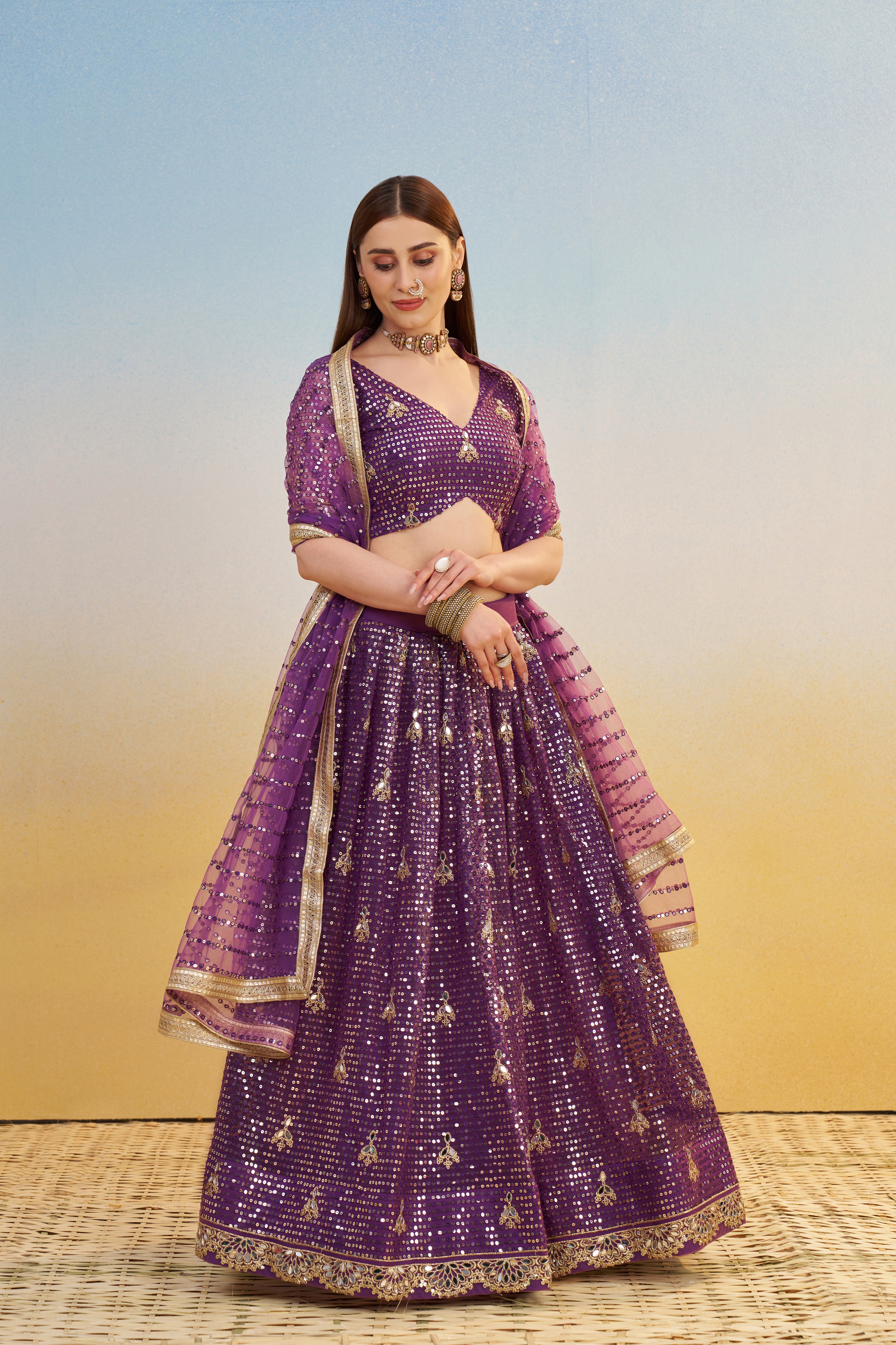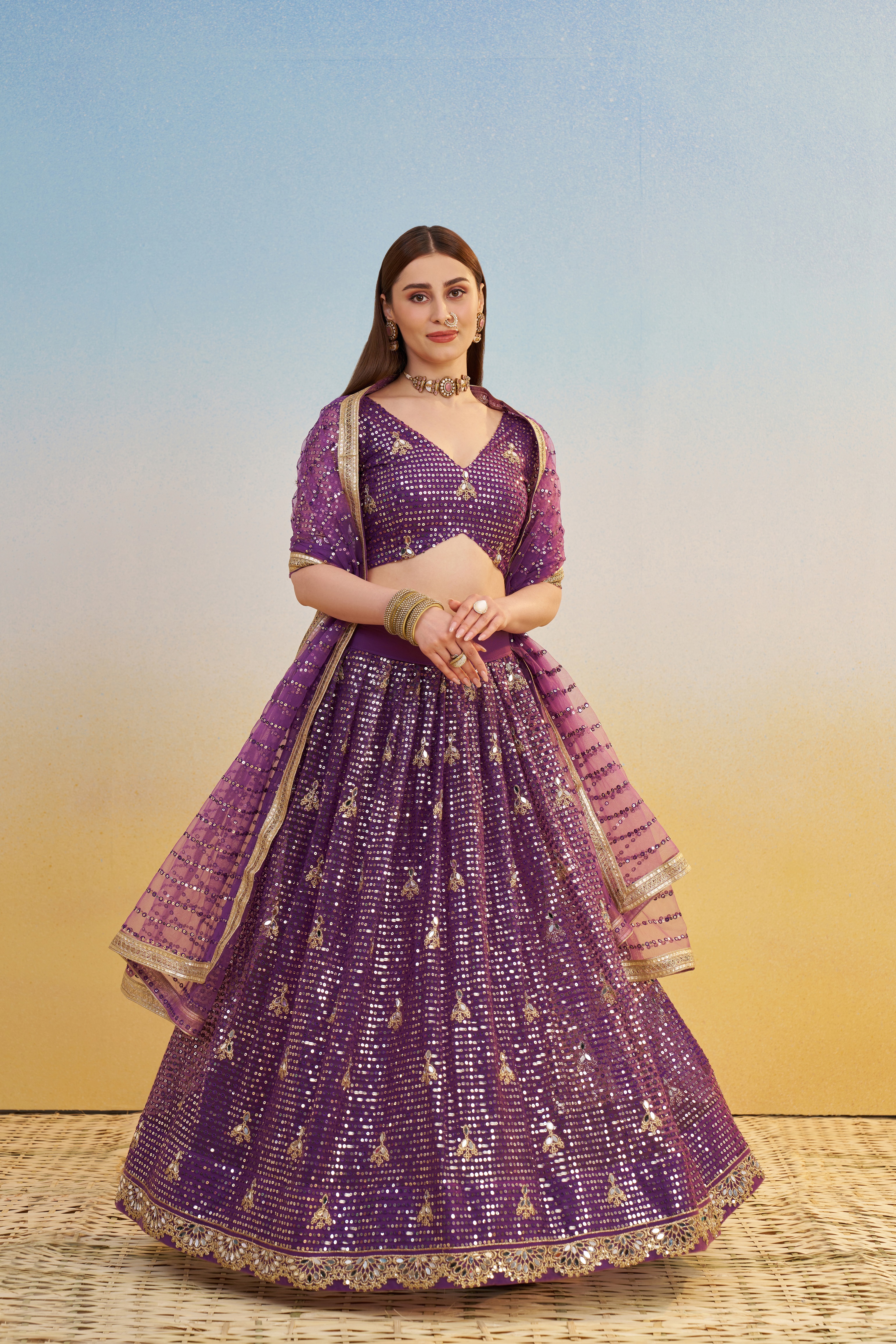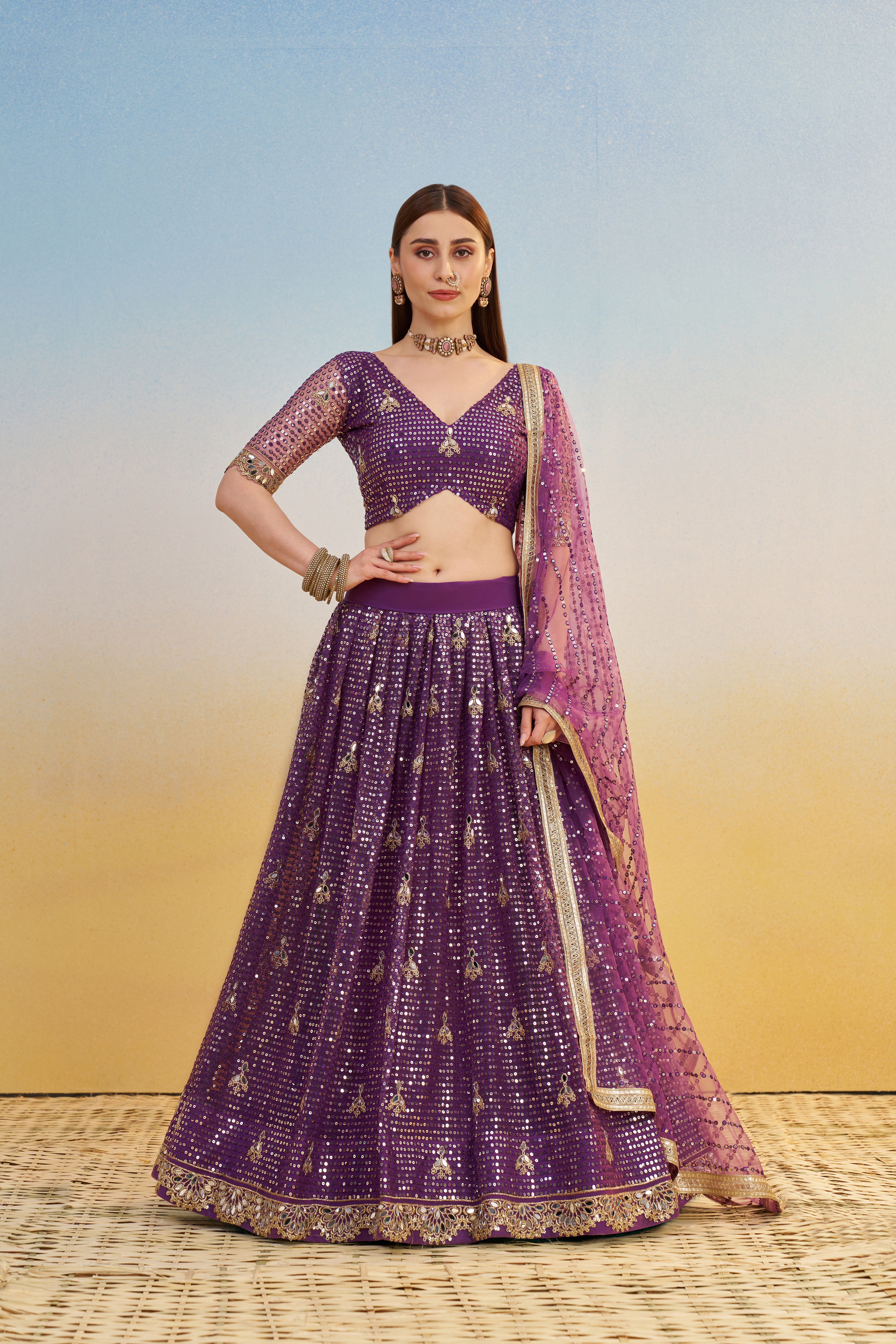 • Includes lehenga (skirt), matching choli (blouse) and dupatta for a coordinated ethnic look.