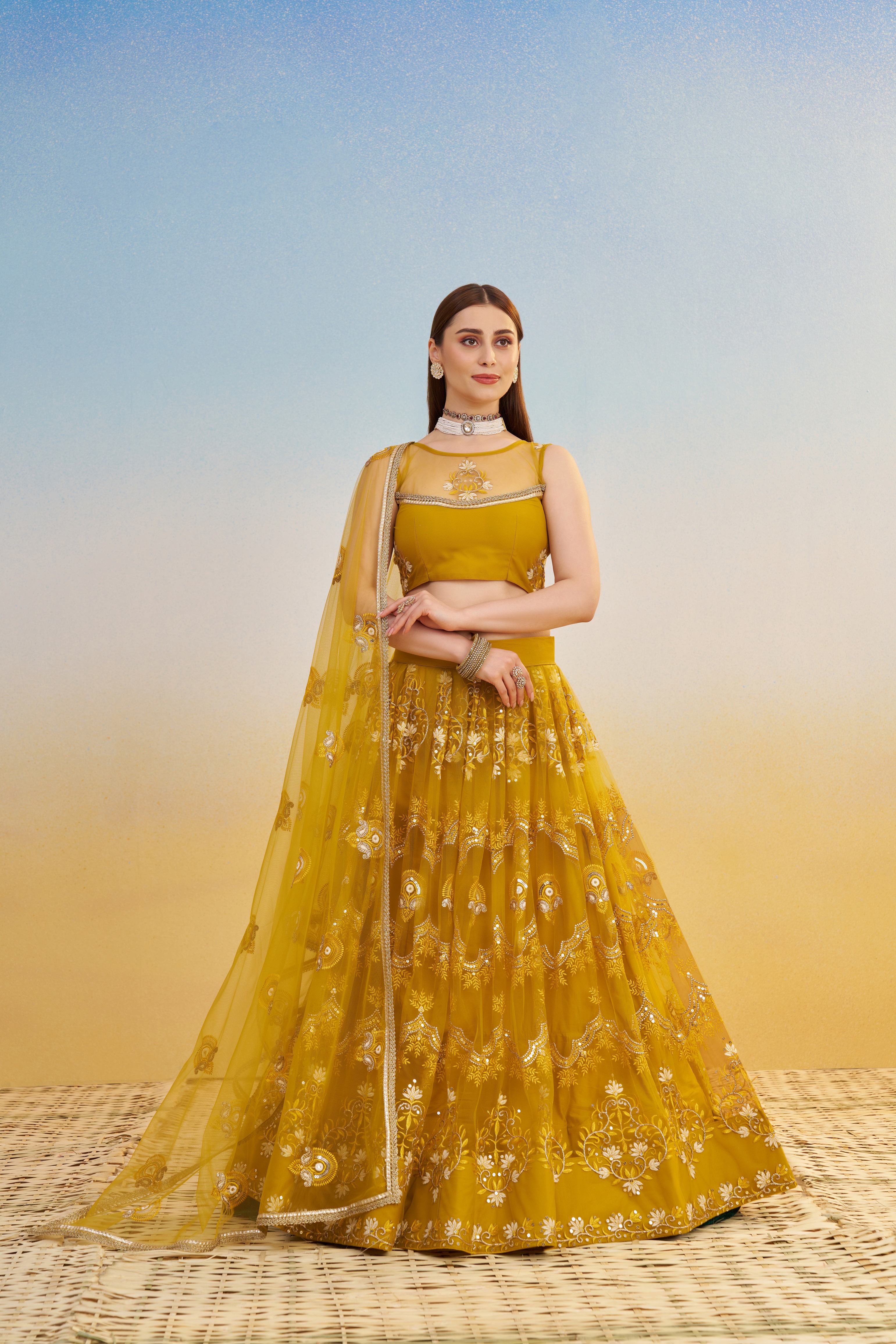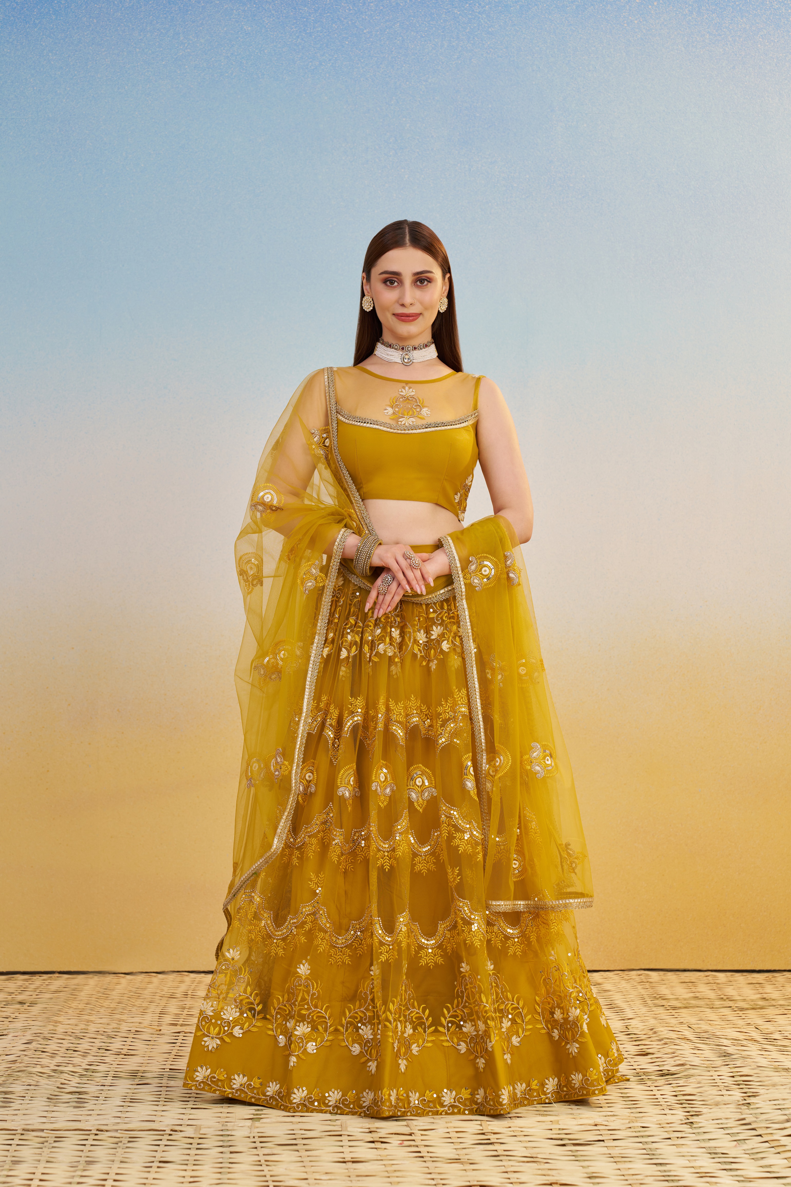 Designer Lehenga Choli Set with Dupatta Butterfly Net Fabric Tone To Tone Thread Work, Zari Work And Sequence Work Embroidery With Readymade Fancy Lace for Women – Mustardyellow Color