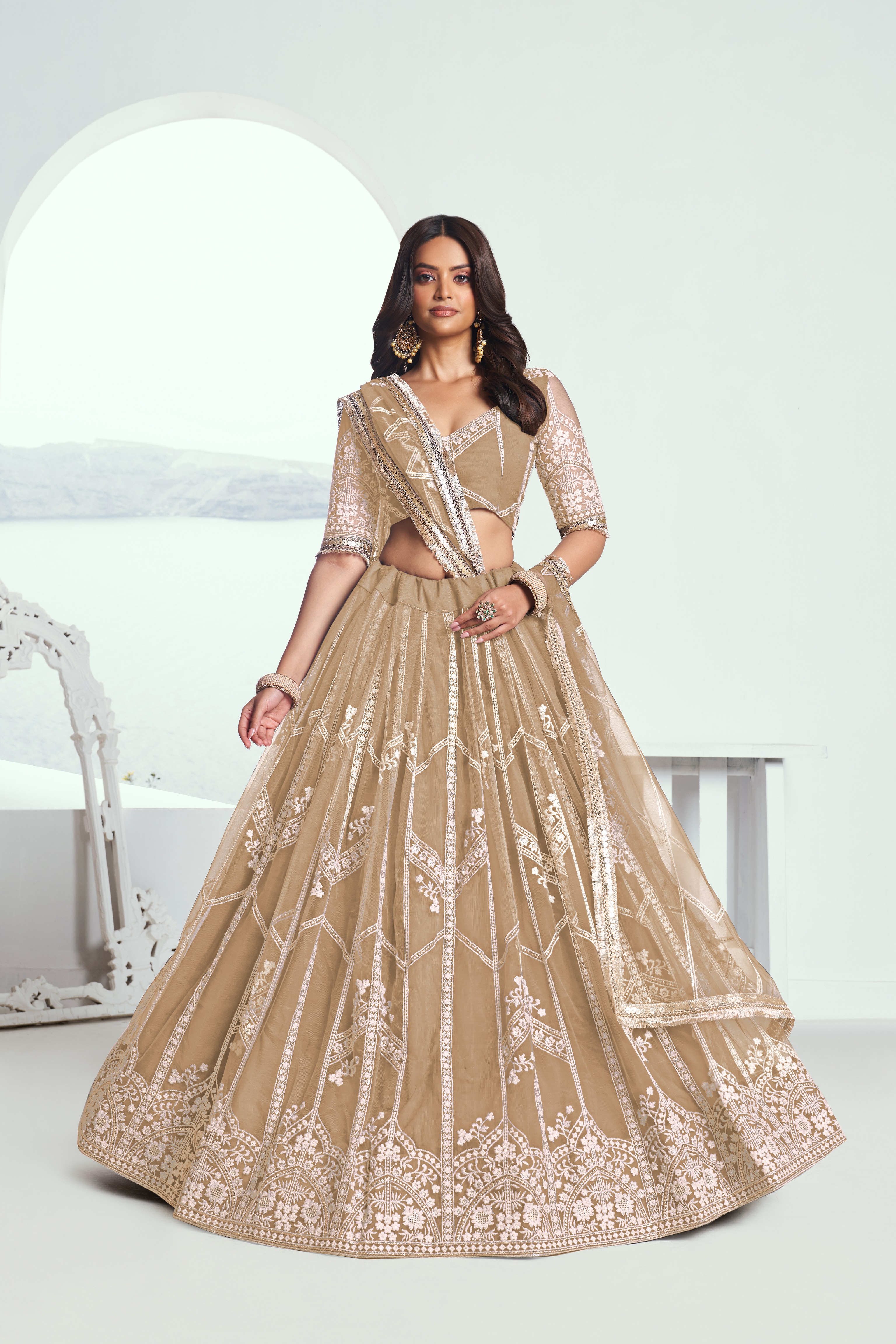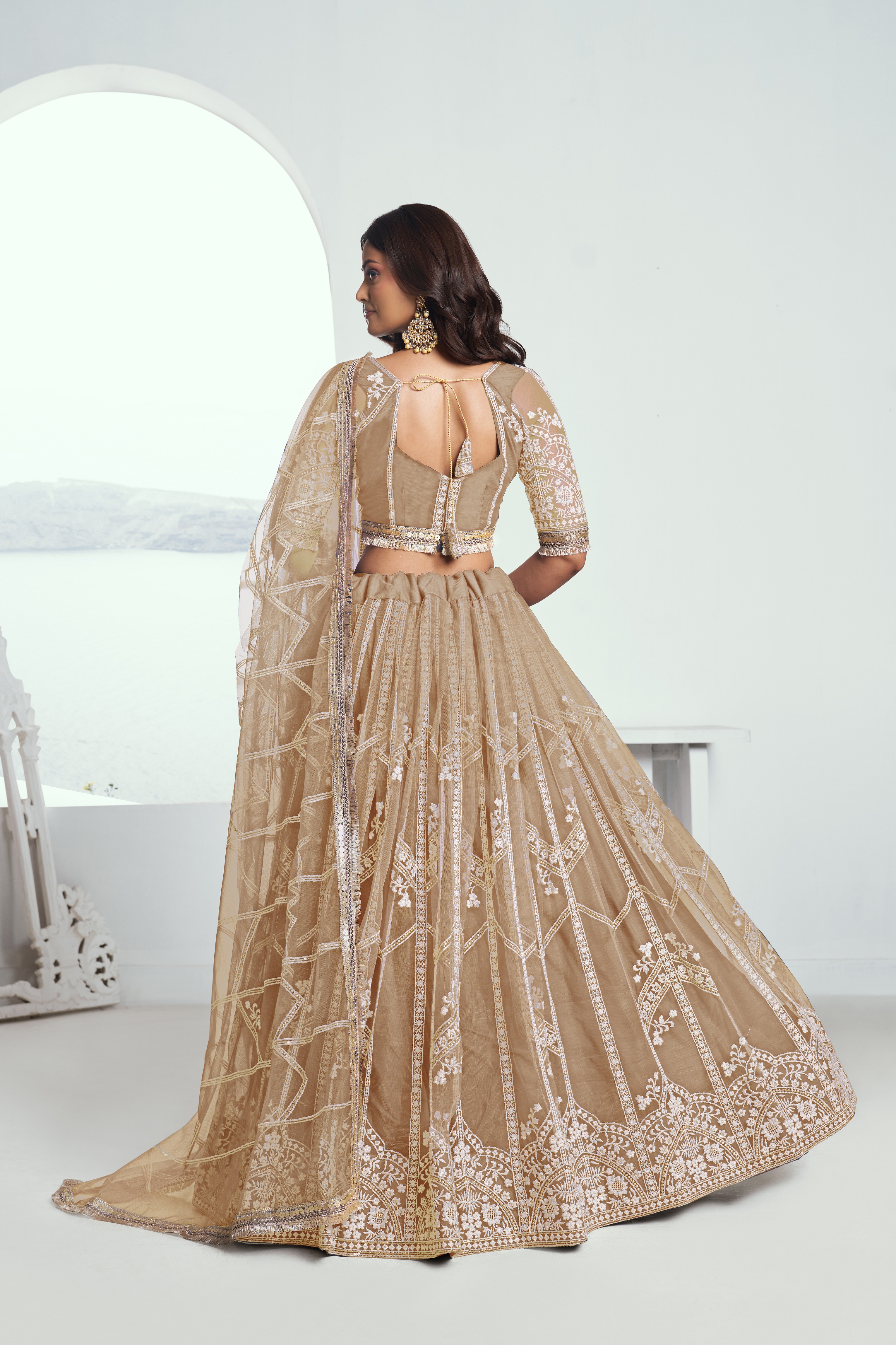 Designer Lehenga Choli Set with Dupatta Butterfly Net Fabric Zari Work And Sequence Work Embroidery for Women – Beige Color