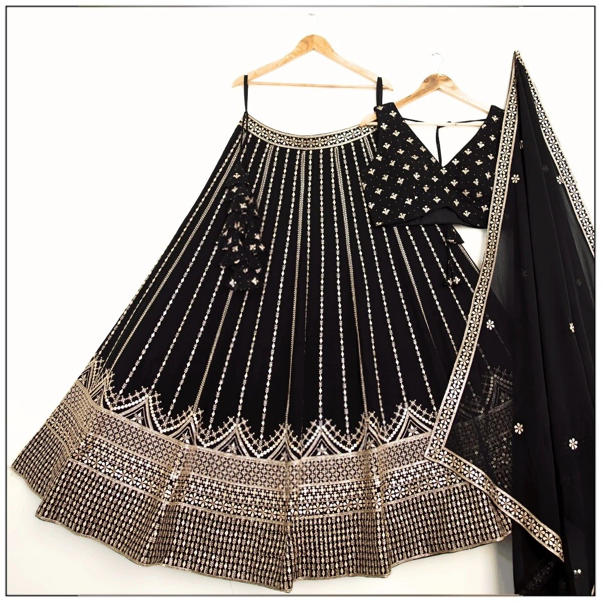 LEHENGA(BOTTOM), FABRIC:- FAUX GEORGETTE, INNER:- CREPE, WORK:- 3MM5MM SEQUINS WITH JARI EMBROIDERY WORK, STITCH:- SEMI STITCHED(WITH KENKEN AND KENVAS), SIZE:- 42HEIGHT AND 42 TO 44 WAIST, FLAIR:- 3.50 METER FLAIR, CHOLI(TOP), FABRIC:- FAUX GEORGETTE, INNER:- CREPE, BLOUSE SIZE:- 1 METER EMBROIDERED FABRIC, WORK:- 3MM5MM SEQUINS WITH JARI EMBROIDERY WORK, STITCH:- UN STITCHED EMBROIDERED FABRIC WITH INNER FABRICS, DUPATTA, FABRIC:- FAUX GEORGETTE WITH LACE BORDER WORK, WORK:- 3MM5MM JARI EMBROIDERY WORK, SIZE:- 2.25 METER DUPATTA, STITCH:- FULL STITCHED, ADDITIONAL, WASH CARE: - DRY CLEAN ONLY, COLOR: - PRODUCT COLOR MAY SLIGHTLY VARY DUE TO PHOTOGRAPHIC LIGHTNING SOURCES OR YOUR DEVICE DISPLAY SETTINGS, THESE ARE MADE TO ORDER DESIGNER STYLES, HENCE EXPECT A SLIGHT VARIATION FROM THE IMAGE DISPLAYED.