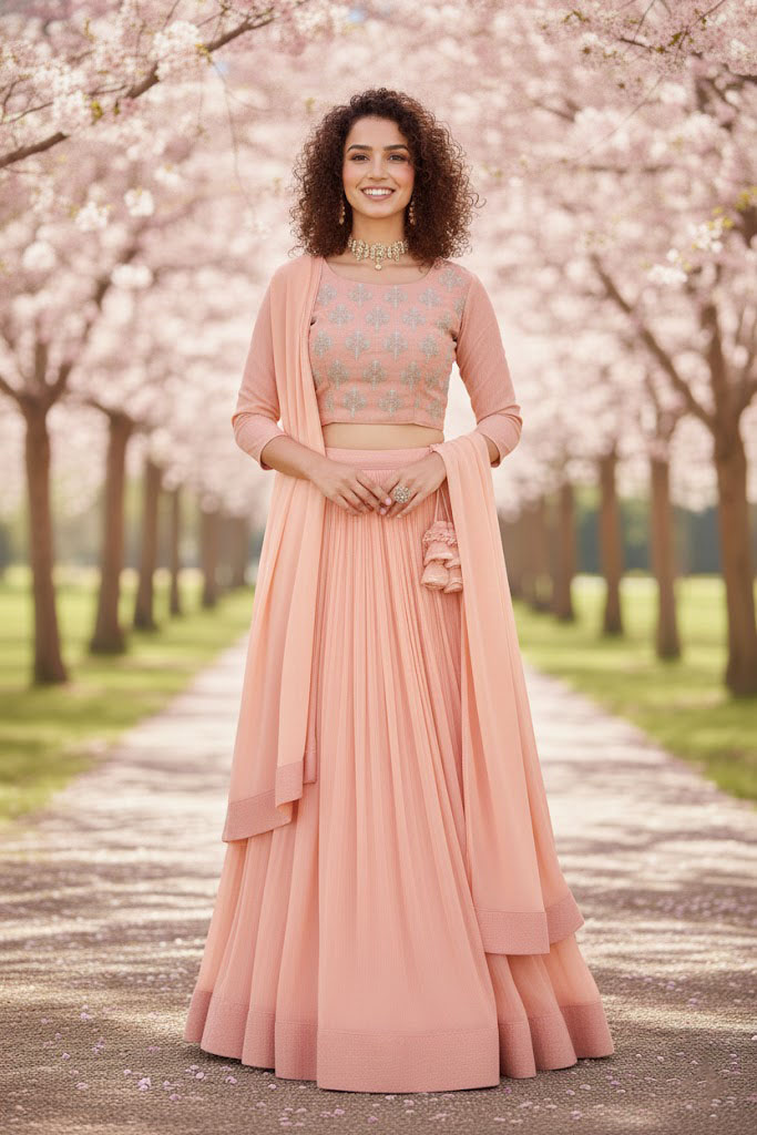 LEHNGA(BOTTOM)FABRIC:- FAUX GEORGETTEINNER:- MICRO FABRICWORK:- CRUSH WORKSTITCH:- SEMI STITCHED WITH CANVASSIZE:- 42HEIGHT AND 42WAISTFLAIR:- 4.80 TO 5.00 METER FLAIR COLOR:- PEACHCHOLI(TOP):-FABRIC:- HEAVY BANGLORI SILKSIZE:- 0.80 METER FABRICWORK:- 3MM SEQUENCE WITH JARI EMBROIDERY WORK STITCH:- UN STITCHED FABRICCOLOR:- PEACHDUPATTA:-FABRIC:- FAUX GEORGETTESIZE:- 2.25 METER DUPATTASTITCH:- FULL STITCHEDCOLOR:- PEACH.