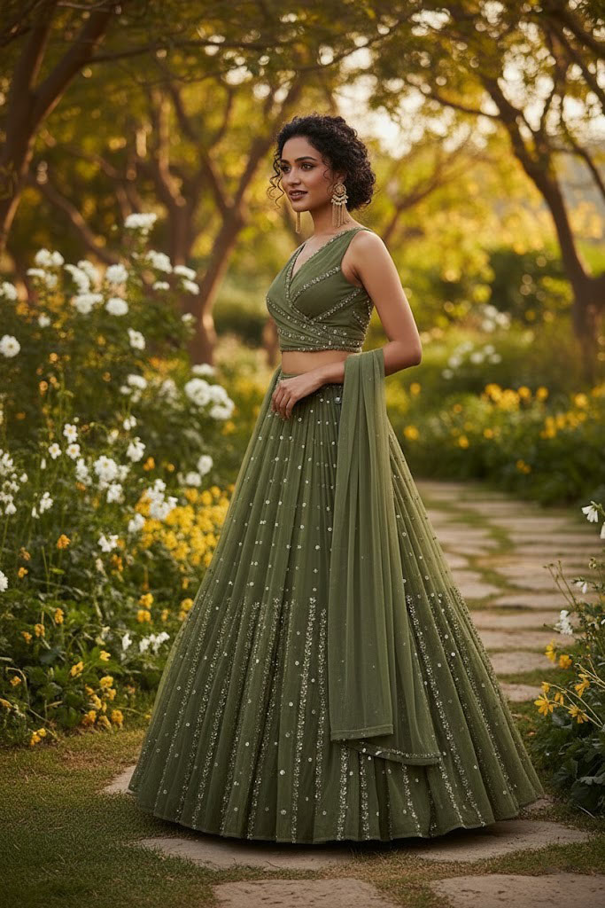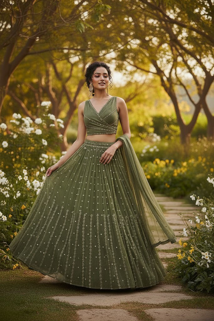 Olive Green Embroidered Georgette Lehenga Set