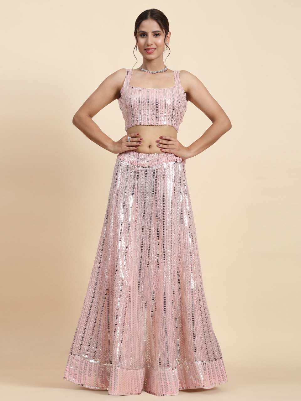 LEHENGA(BOTTOM)FABRIC:- FAUX GEORGETTEINNER:- MICRO FABRICWORK:- 3MM AND 7MM SEQUINS EMBROIDERY WORKSTITCH:- SEMI STITCHED WITH CANCAN AND CANVASSIZE:- 42 HEIGHT AND 42 WAIST FLAIR:- 3 METERCHOLI(TOP):-FABRIC:- FAUX GEORGETTEINNER:- MICRO FABRICSIZE:- 0.80 METER CHOLI EMBOIDERED FABRIC 0.40 METER SLEVES EMBROIDERED FABRICWORK:- 3MM AND 7MM SEQUINS EMBROIDERY WORK STITCH:- UN STITCHED FABRICDUPATTA:-FABRIC:- NETWORK:- 3MM AND 7MM SEQUINS EMBROIDERY LACE BORDER WORK SIZE:- 2.25 METER DUPATTASTITCH:- FULL STITCHADDITIONALWASH CARE: - DRY CLEAN ONLYCOLOR: - PRODUCT COLOR MAY SLIGHTLY VARY DUE TO PHOTOGRAPHIC LIGHTNING SOURCES OR YOUR DEVICE DISPLAY SETTINGSTHESE ARE MADE TO ORDER DESIGNER STYLES, HENCE EXPECT A SLIGHT VARIATION FROM THE IMAGE DISPLAYEDIN THE BOX 1 PIECE LEHENGA 1 PIECE DUPATTA 1 PIECE BLOUSE FABRIC.