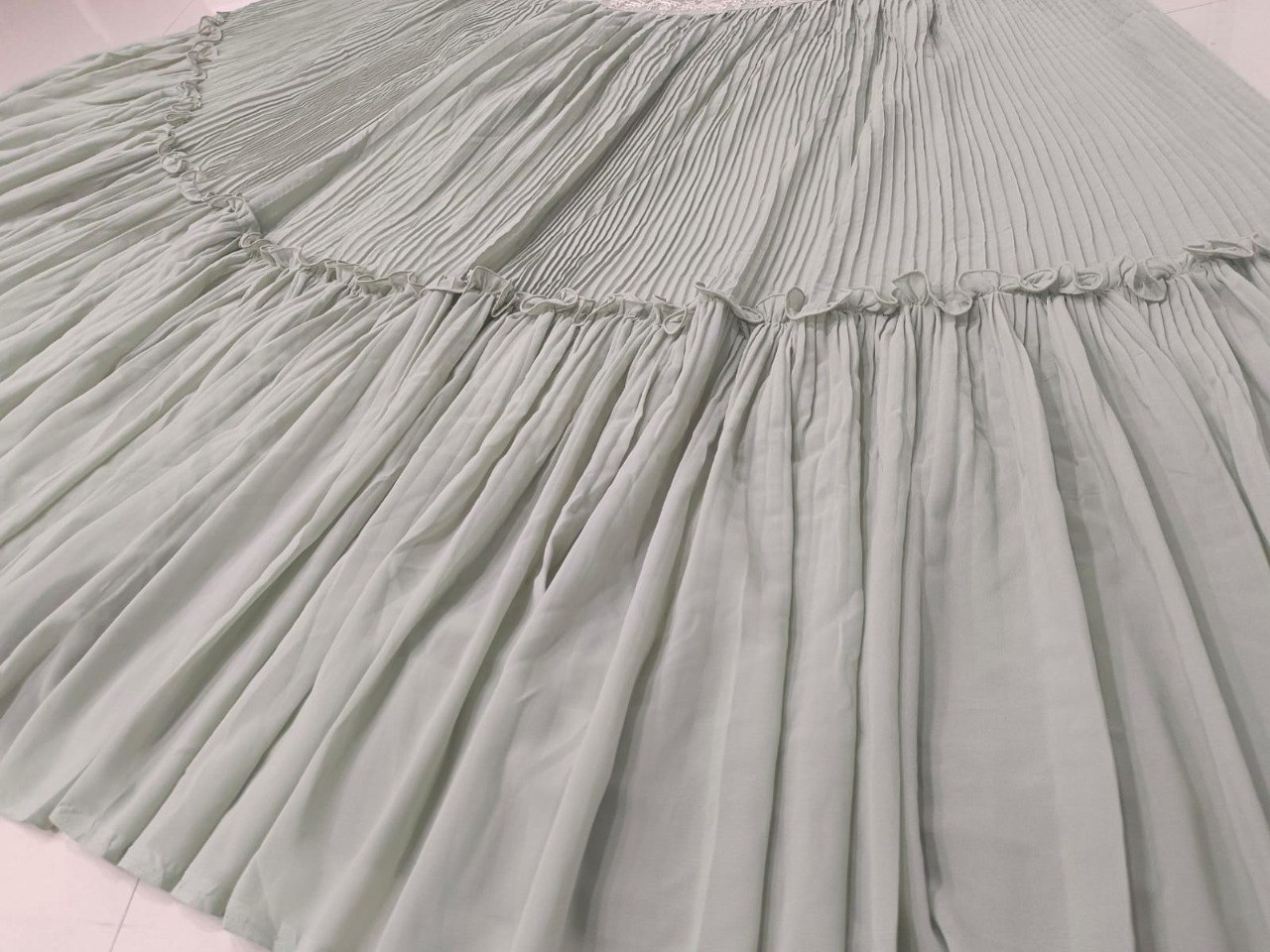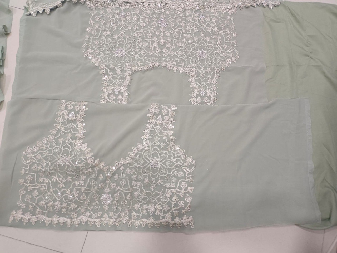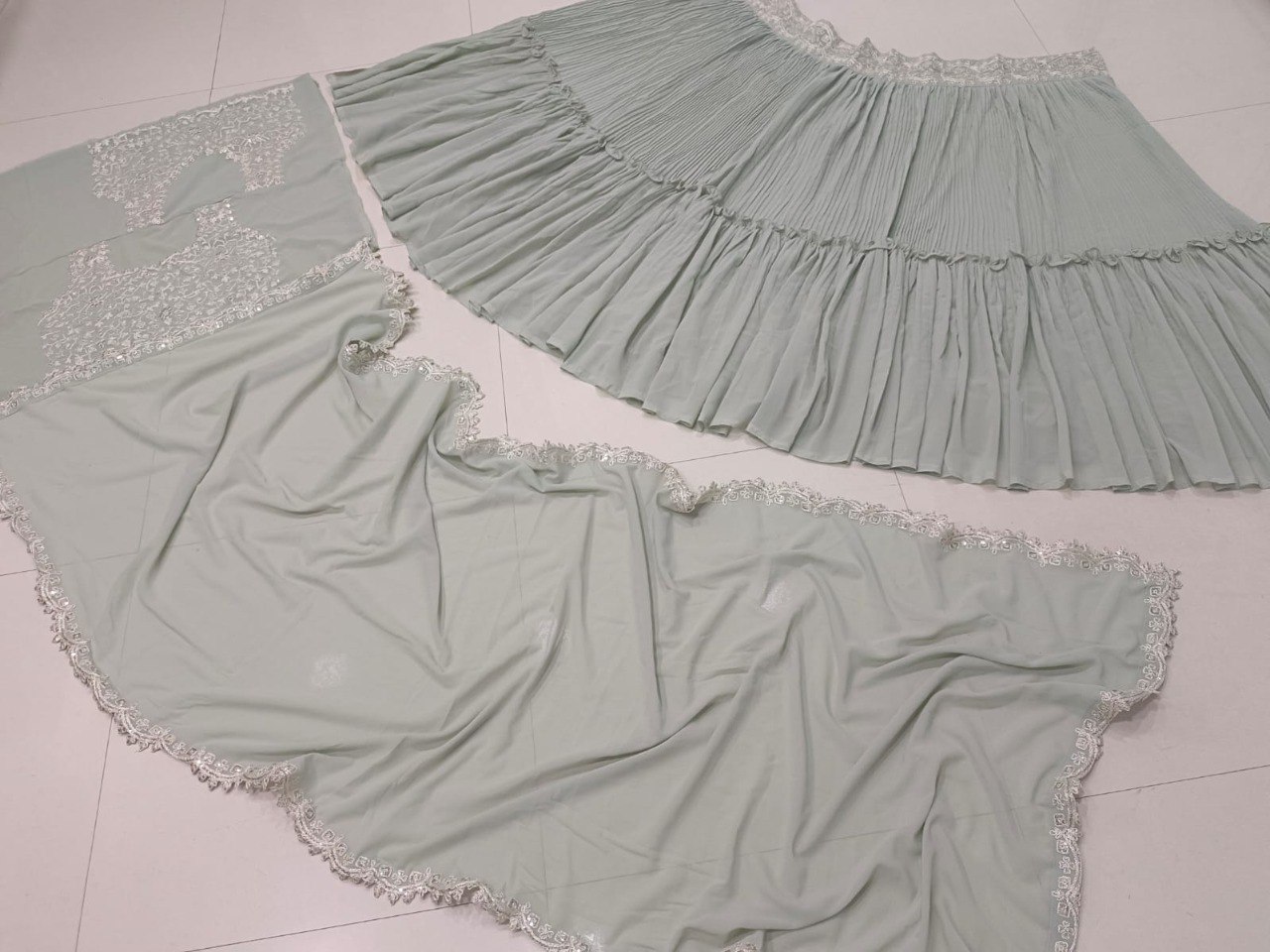 LEHNGA(BOTTOM)FABRIC:- GEORGETTEINNER:- MICRO FABRIC WITH CANVAS(NON WOVEN)WORK:- TWO-TIER CRUSH STITCH:- SEMI STITCHEDSIZE:- 42HEIGHT AND 42WAISTFLAIR:- 5.80 TO 6.00 METER FLAIR COLOR:- SEA GREENCHOLI(TOP)FABRIC:- GEORGETTESIZE:- 0.80 METER WORK:- 3MM AND DORI EMBROIDERY WORK STITCH:- UN STITCHED COLOR:- SEA GREENINNER:- MICRODUPATTAFABRIC:- GEORGETTE WORK:- PLAIN SIZE:- 2.25 METER DUPATTASTITCH:- FULL STITCHEDCOLOR:- SEA GREENADDITIONALWASH CARE: - DRY CLEAN ONLYCOLOR: - PRODUCT COLOR MAY SLIGHTLY VARY DUE TO PHOTOGRAPHIC LIGHTNING SOURCES OR YOUR DEVICE DISPLAY SETTINGSTHESE ARE MADE TO ORDER DESIGNER STYLES, HENCE EXPECT A SLIGHT VARIATION FROM THE IMAGE DISPLAYEDIN THE BOX 1 PIECE LEHENGA 1 PIECE DUPATTA 1 PIECE BLOUSE FABRIC.