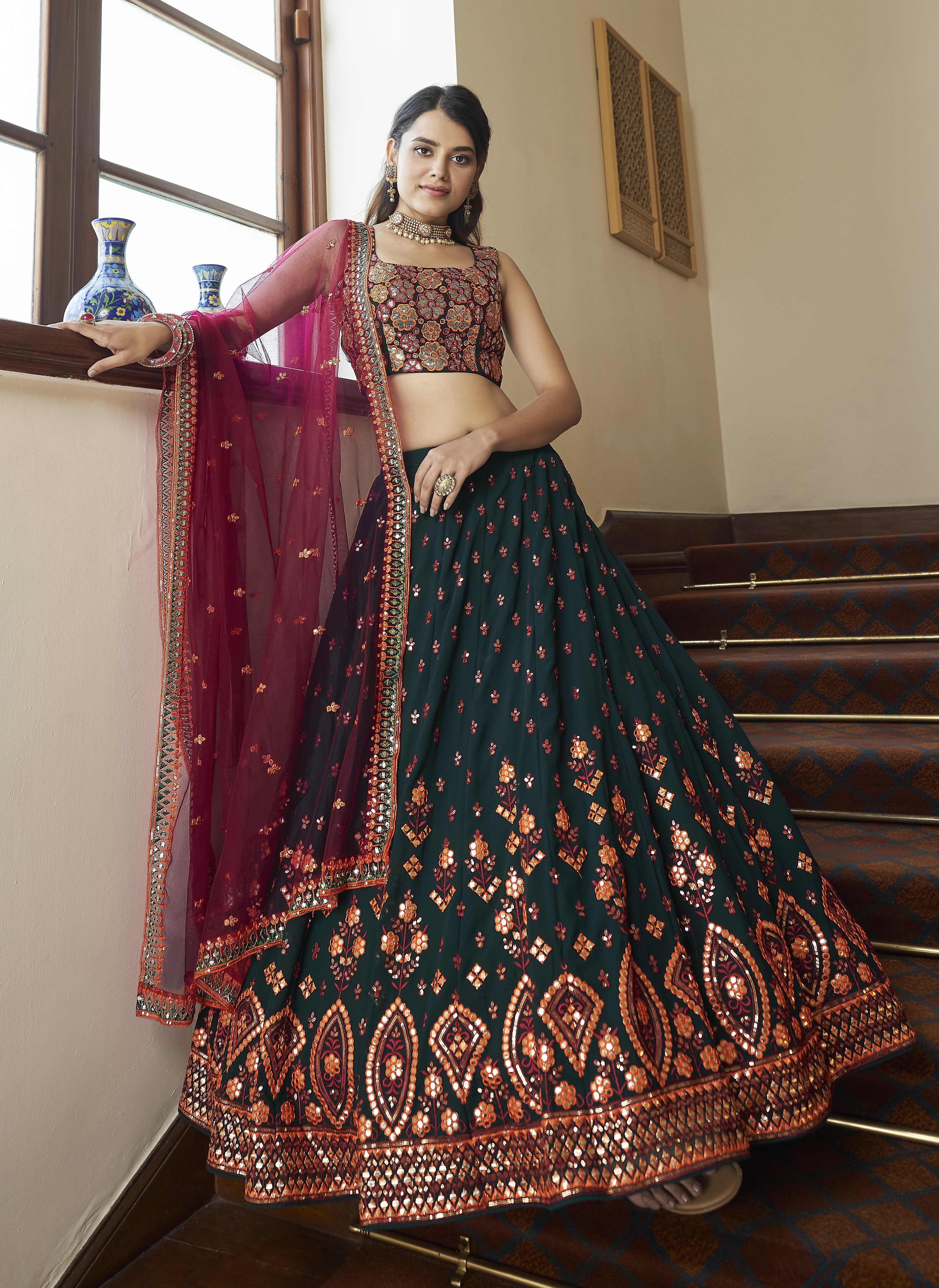 Elevate your ethnic look with this dark green faux georgette lehenga featuring thread embroidery work. Designed for festive occasions and celebrations, it offers a graceful flow and timeless appeal.Crafted from lightweight faux georgette fabric with a semi-stitched finish, this lehenga ensures comfort and easy customization. Dry clean recommended.