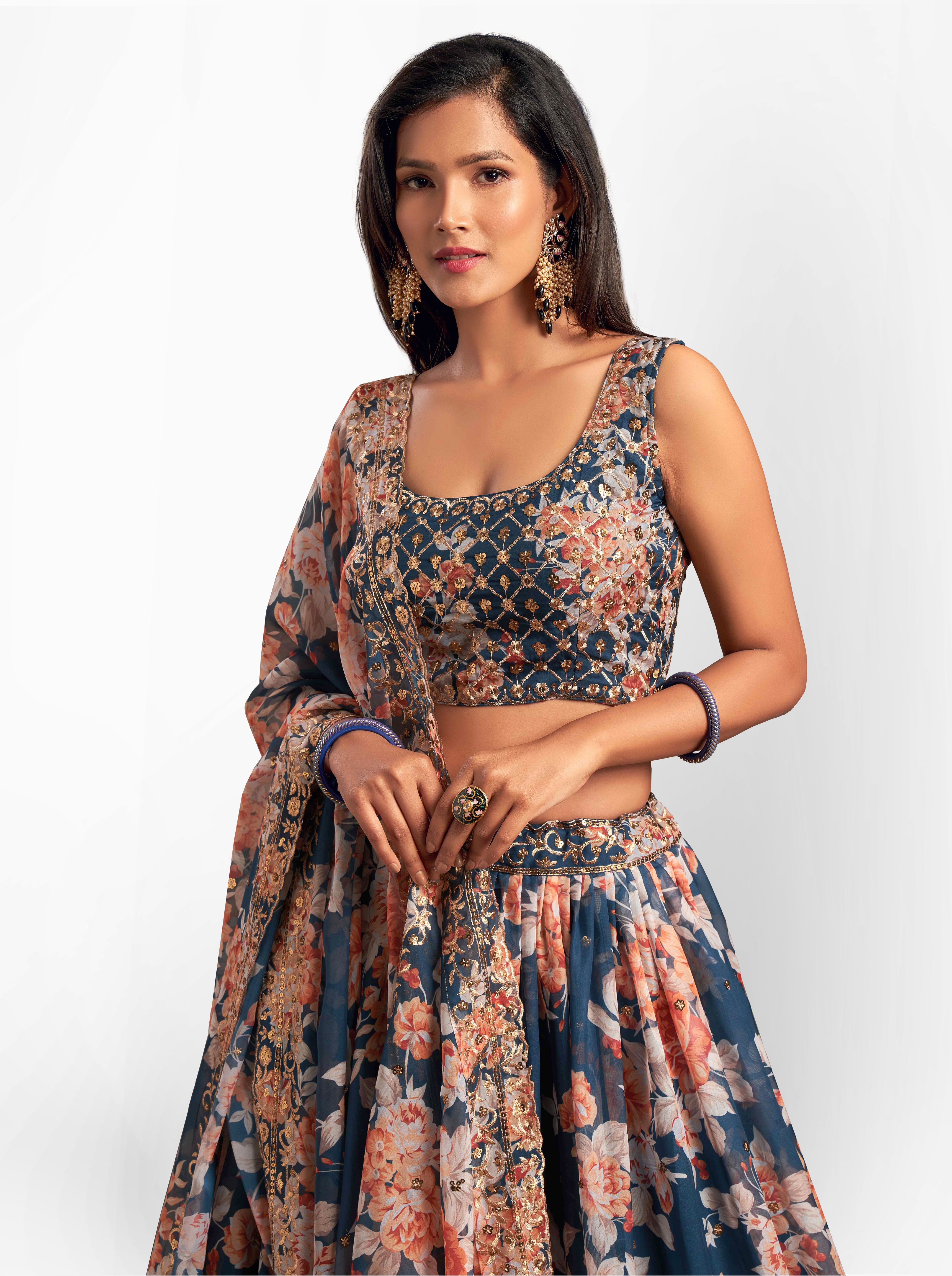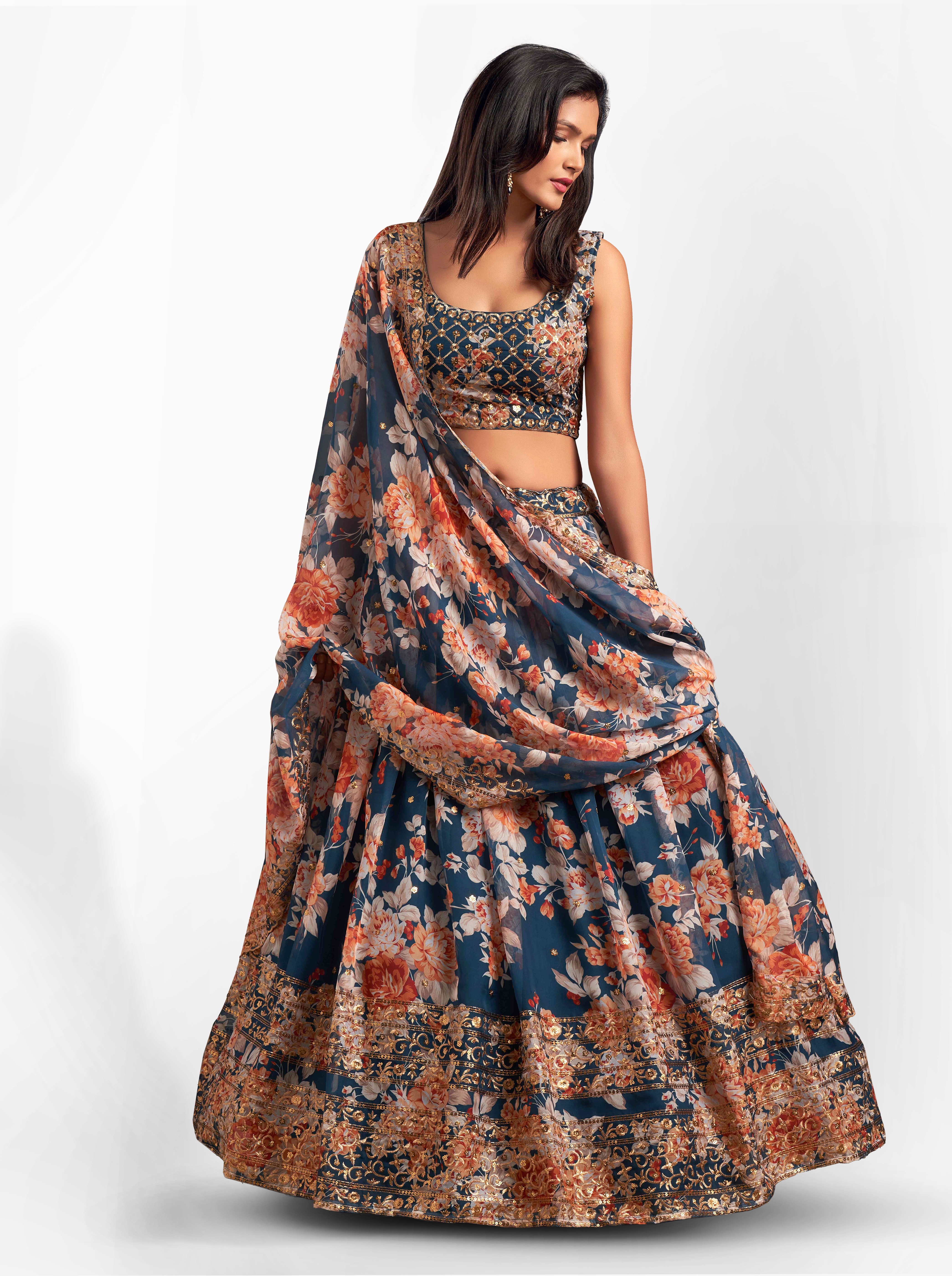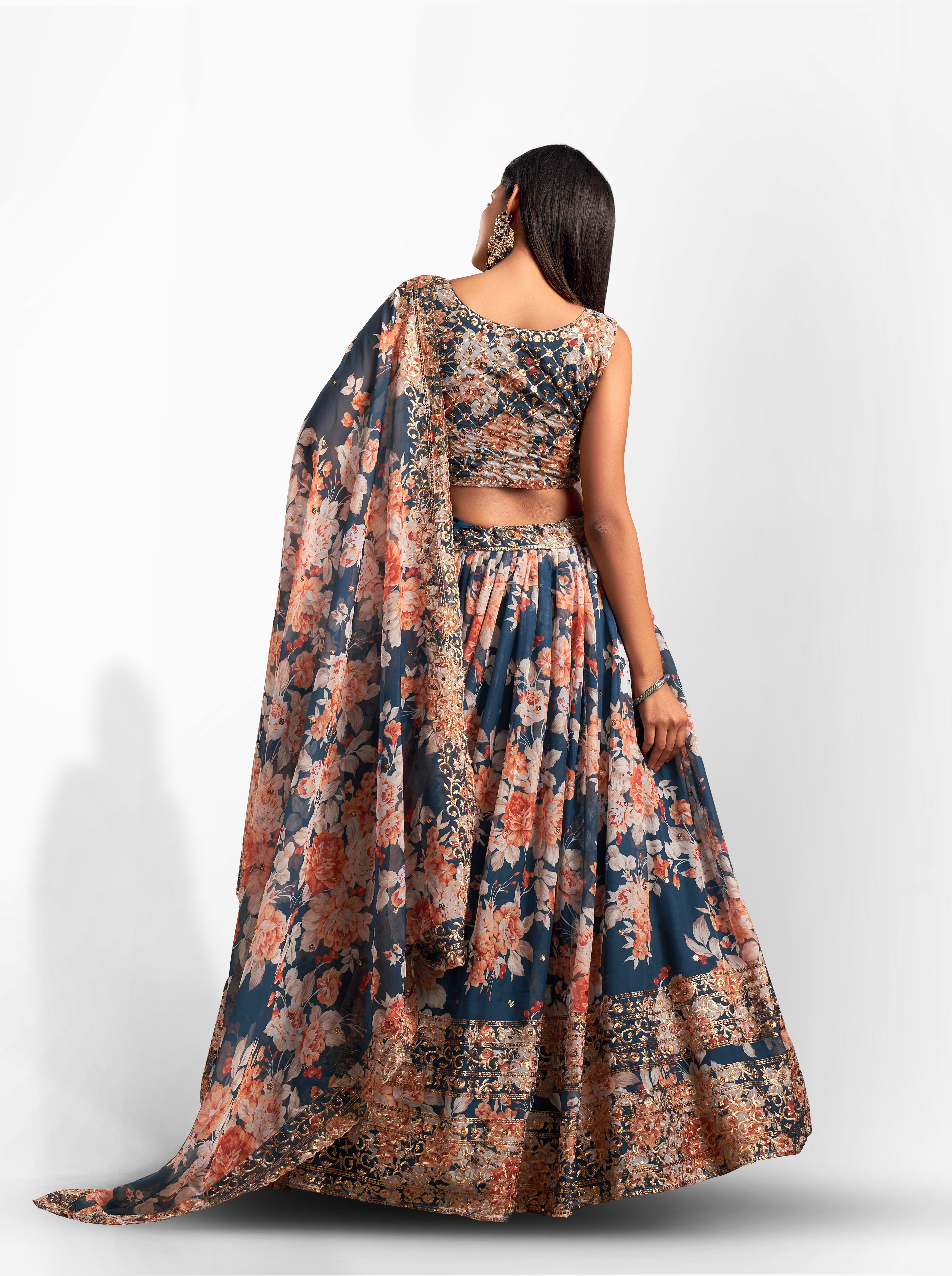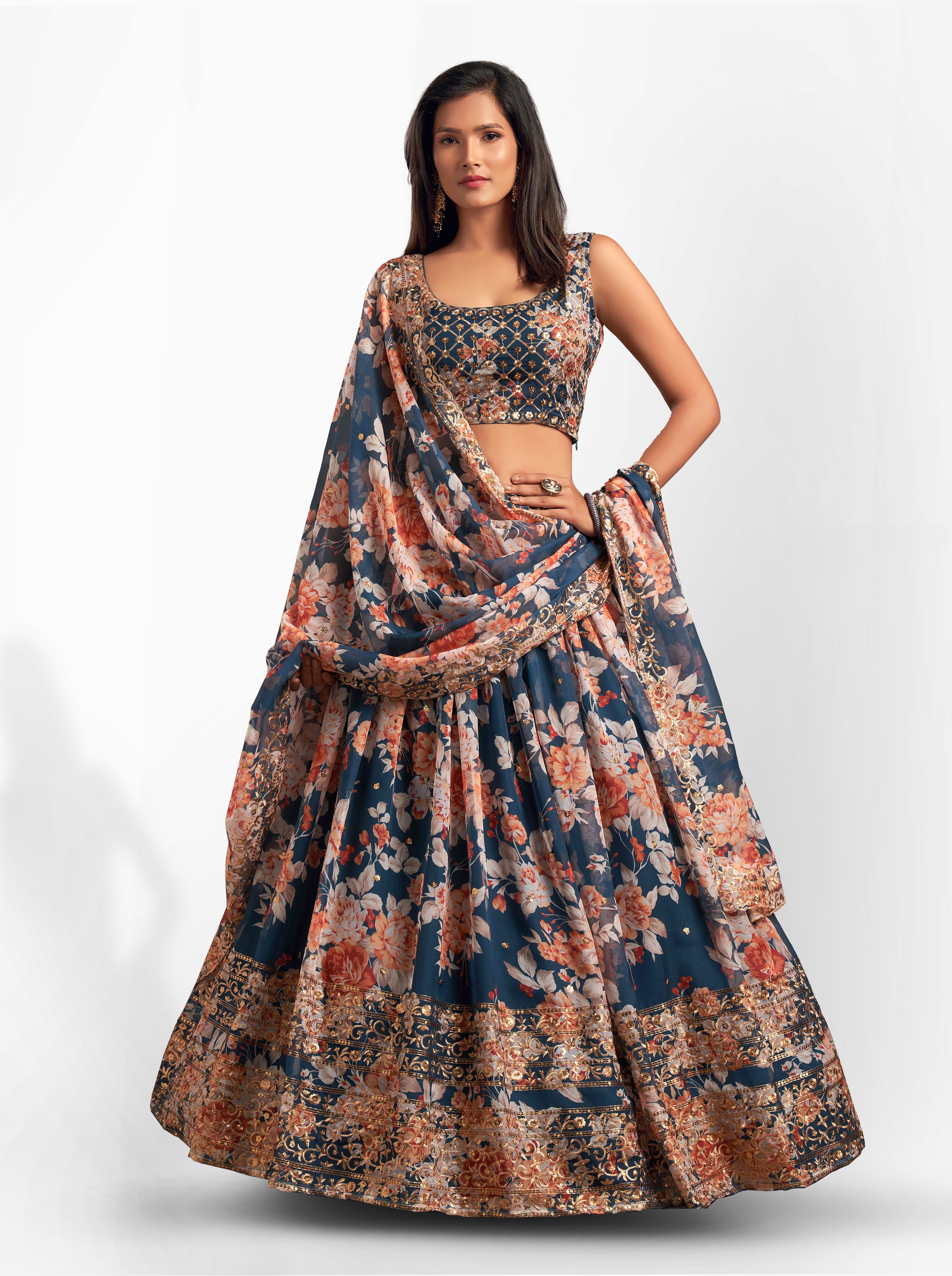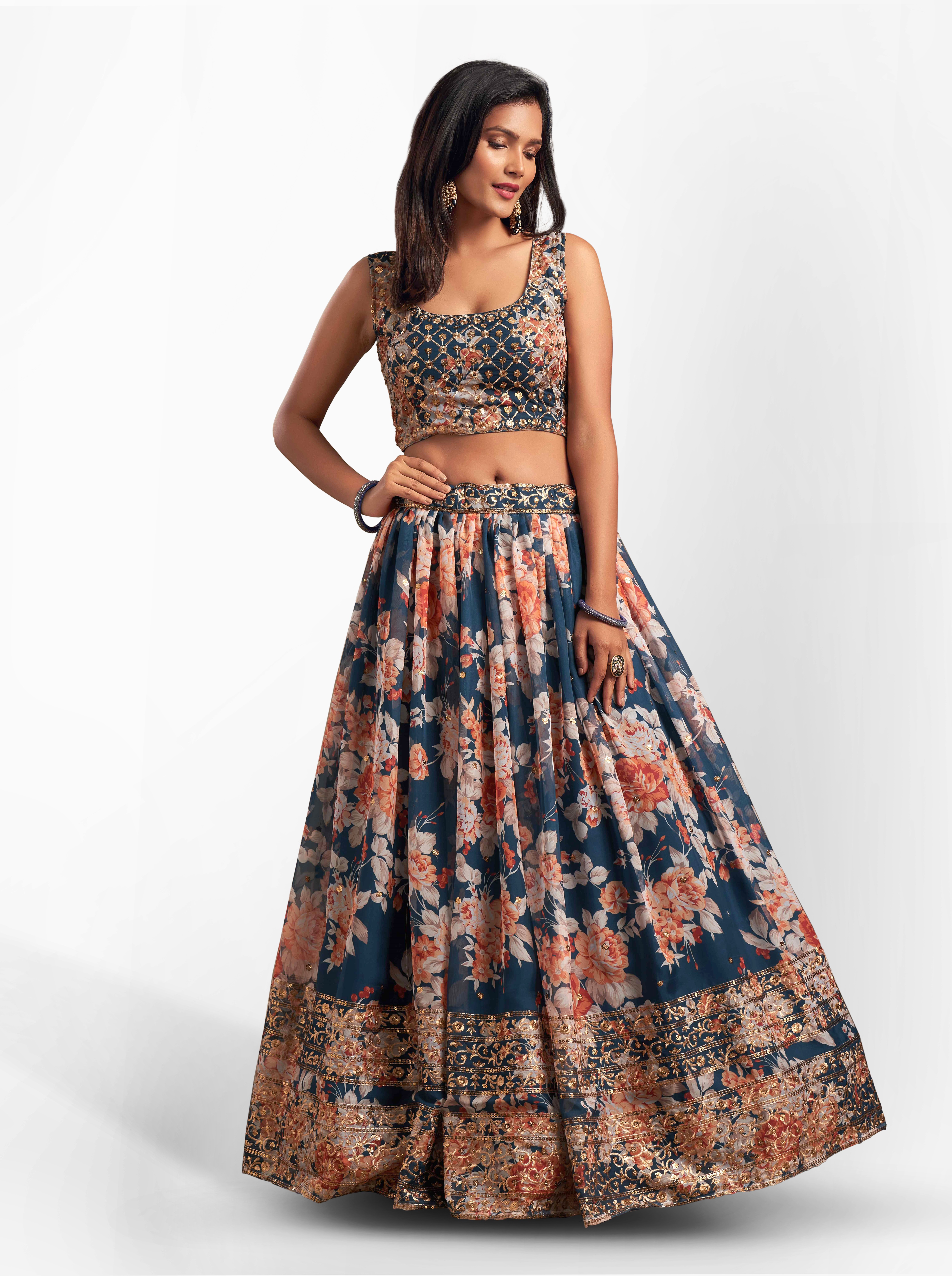 Elevate your ethnic look with this dove blue organza lehenga featuring sequence work,floral work embroidery work. Designed for festive occasions and celebrations, it offers a graceful flow and timeless appeal.Crafted from lightweight organza fabric with a semi-stitched finish, this lehenga ensures comfort and easy customization. Dry clean recommended.
