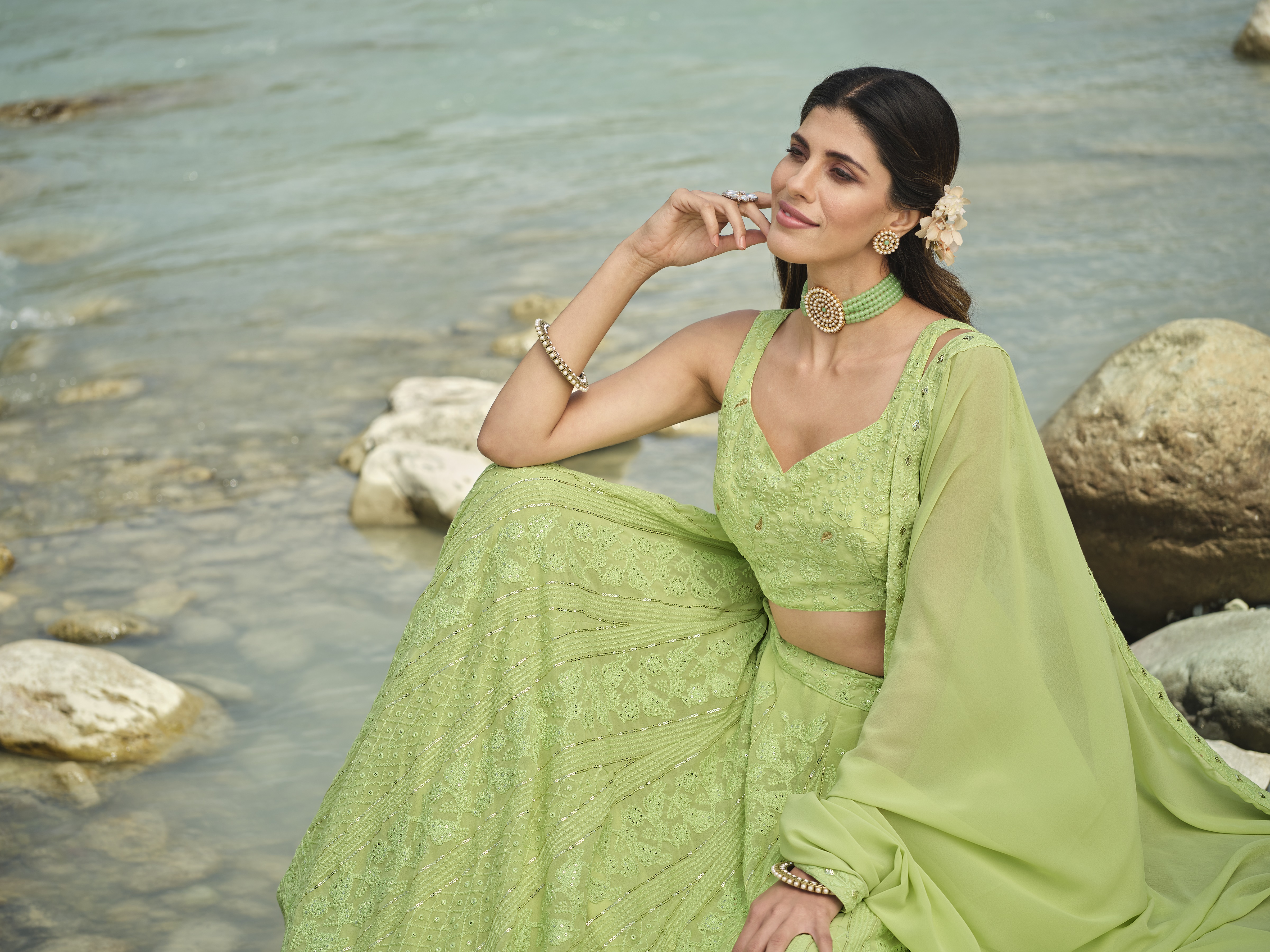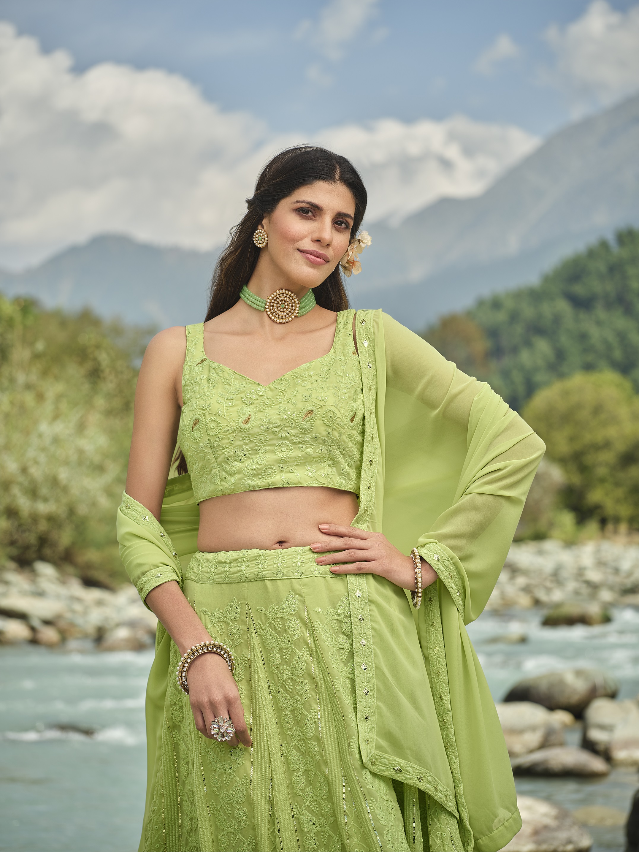 Womens Light Green Faux Georgette Thread Embroidery Lehenga Set